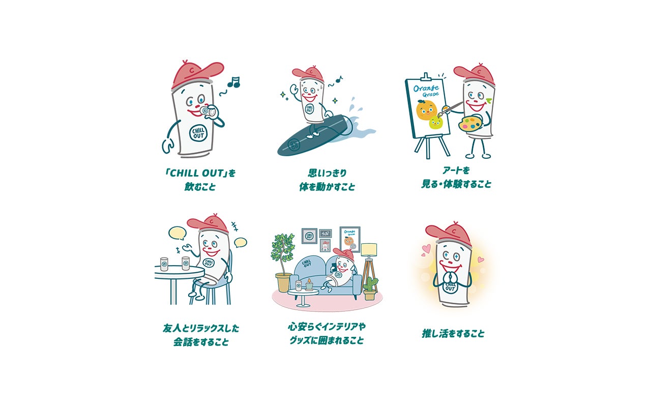 人気のアーティストたちによるオリジナルデザインの「CHILL OUT」がランダムで出てくる「CHILL OUT」オリジナル自動販売機が登場。シティポップ、ファッション、音楽・アニメ、ゲームをテーマに活動するアーティストがストレス解放をテーマに描き下ろした「チルするアート缶」で、ささやかなアート体験をお届けします。