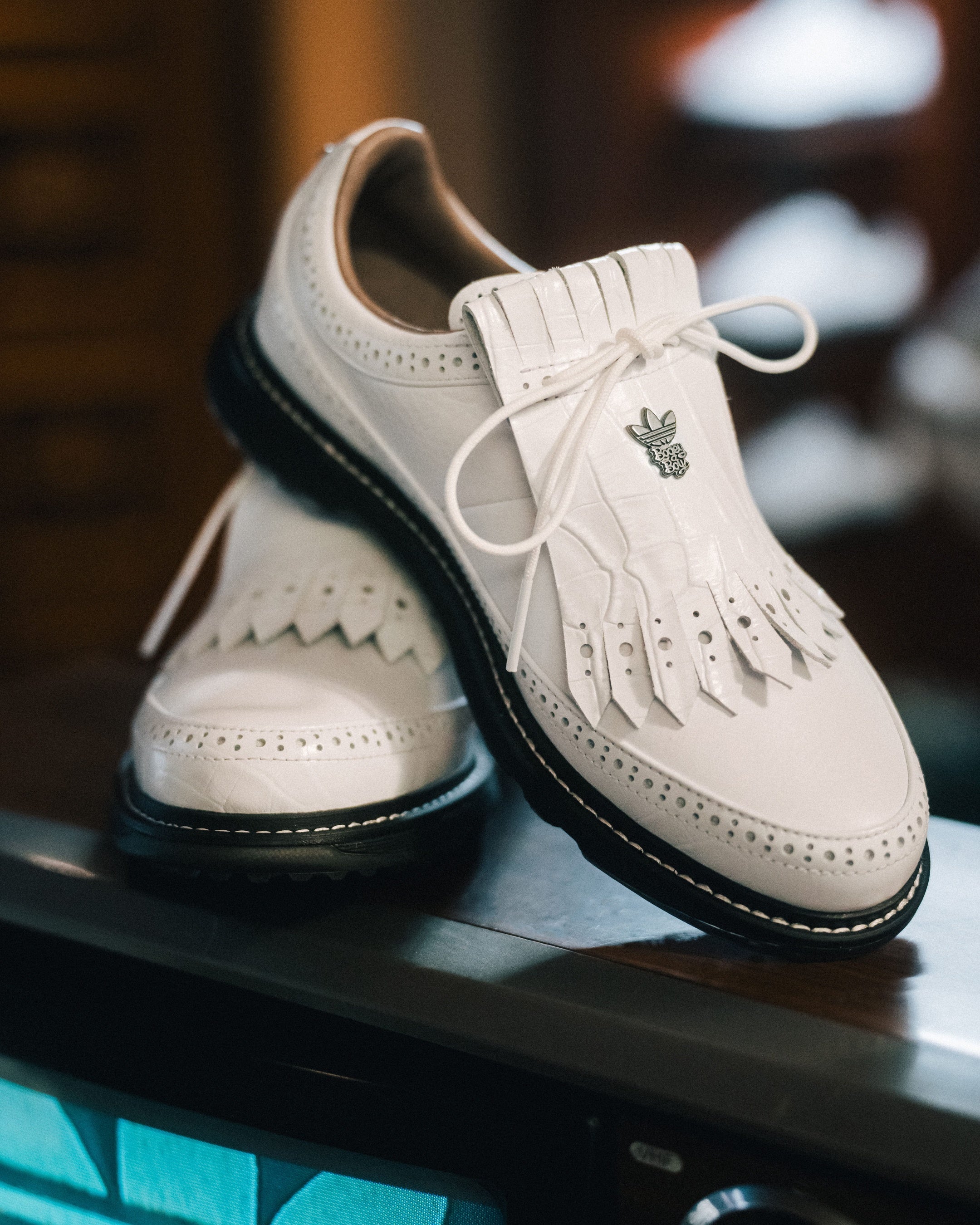 「adidas x Bogey Boys」からは、新しいスパイクレスシューズ「MC80 Bogey Boys」も登場します。アディダスが誇る80年代のフットウェアアーカイブにあるクラシックなスタイルに、ゴルフに適した最新のテクノロジーを融合させた全く新しいゴルフシューズです。本コレクションの限定版では、オールホワイトの天然皮革をアッパーに採用し、ミッドソールにかけてブローグステッチを施したりやクロコダイル調にすることによって、トラディショナルでリッチなテクスチャーに仕上げました。さらに、軽量性と安定性に優れたLIGHTSTRIKEクッショニングとTPUでできたアウトソールにトルションバーを搭載させることによって、ツアーレベルのグリップ力と安定感を実現。白のステッチが落ち着いた雰囲気のアウトソールのかかと部分には、クッショニング素材のBOOSTをも設置し、クラシカルな見た目からは想像できないような快適性を両立させました。取り外し可能なキルティには、アディダス オリジナルスを象徴する「トレフォイルロゴ」と、Bogey Boysのロゴのワンポイントがついています。MC80は本コレクションの限定版の他に、8月上旬にインラインのモデルも発売を予定しております。