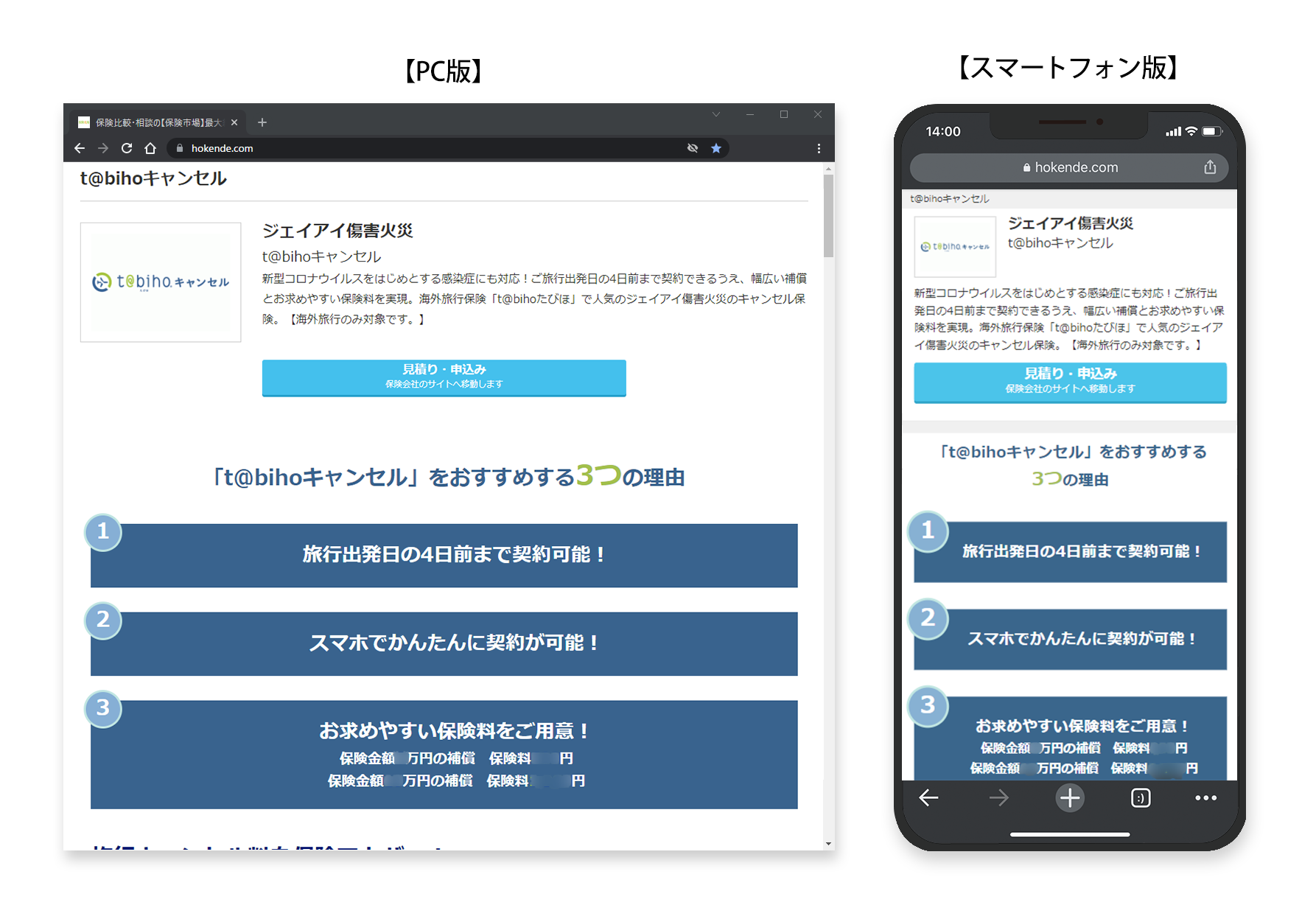 保険選びサイト「保険市場」に掲載を開始したジェイアイ傷害火災の『t@bihoキャンセル』は、インターネットでお申し込みいただける保険商品です。「保険市場」PCサイトおよびスマートフォンサイトにて、商品の詳細をご確認いただけます。