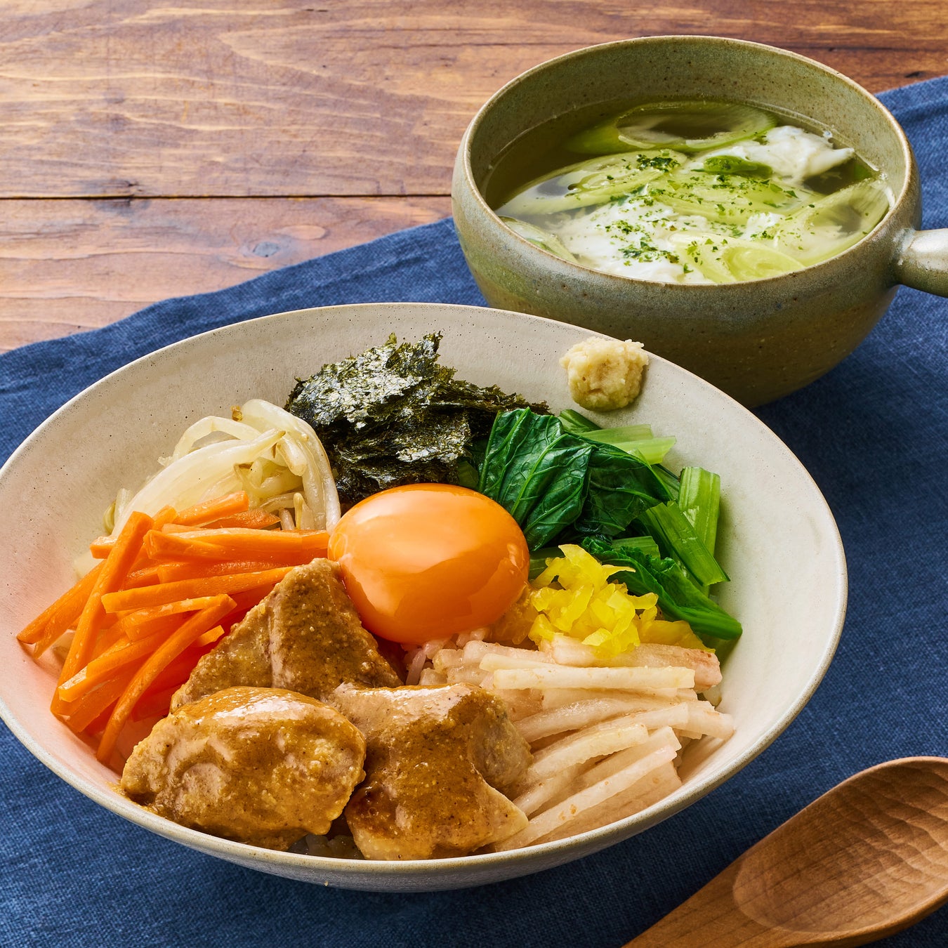 「おおばちまぐろ(厳選めばち鮪など)」の「わかれ身」を柔らかく火入れし、特製のごま味噌だれと卵黄、たっぷりの野菜と合わせて食べる、さっぱりとした和風ビビンバです。味の決め手はお酢を効かせた特製のごま味噌だれ。好相性の西洋わさびと合わせれば、さらに食欲をかきたてます。ビビンバで余った卵の卵白はあおさが香る副菜のスープに活用。海と畑の恵みをとことん余すことなく味わえる食卓が完成します。