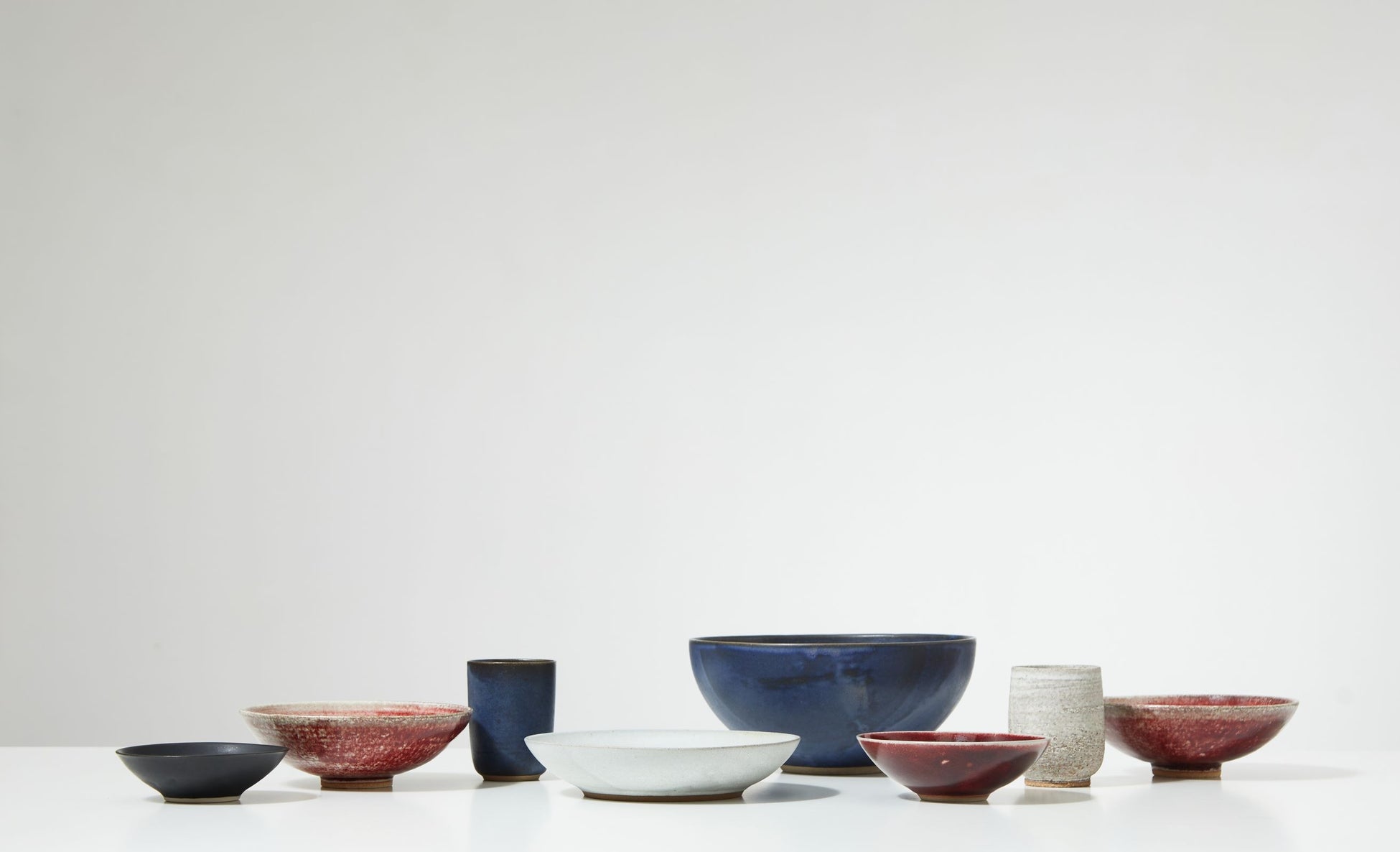 今回のコレクションでは、18世紀の中国にその起源をさかのぼる伝統的な深紅の釉薬「オックスブラッド」を用いたボールやティーカップ、そしてインディゴカラーのビーカーなどが登場。高品質の陶土を使い、独自の焼成技術でさまざまな自家製釉薬の深味を引き出しています。