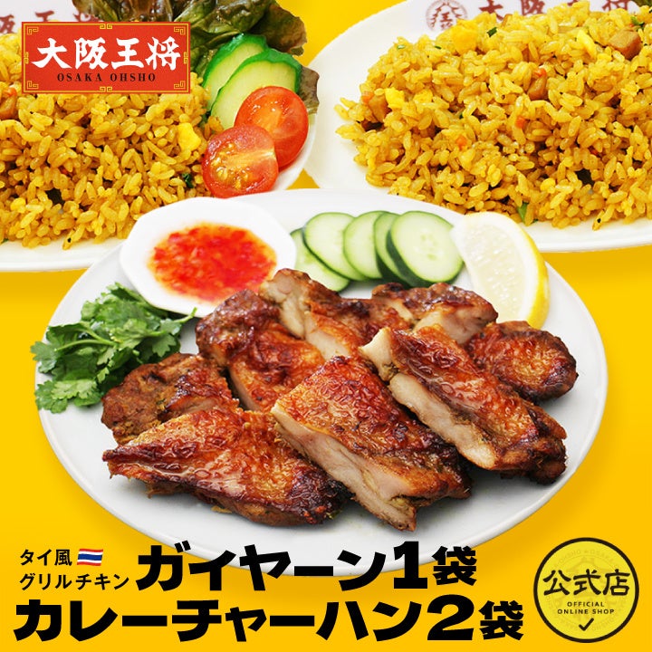 ガイヤーンとは、ナンプラーやレモングラス、にんにくで味付けして炙り焼いたタイの郷土料理です。スパイシーな味と香りは、食卓のメインに、お弁当のおかずにと大活躍。大阪王将公式通販で人気のカレーチャーハンに載せたチキンオーバーライスもおすすめです。調理も、湯煎か電子レンジで温めるだけ。ご自宅で簡単に楽しめる『タイ風グリルチキン ガイヤーン』、これはもう、食べるしかありません。