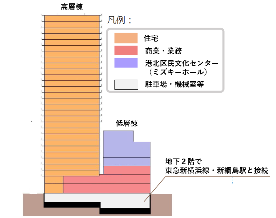 本建物は、共同住宅、商業施設、公益施設が一体となった新綱島駅直結の複合再開発建物で、低層棟と高層棟の2棟で構成されます。低層棟は、1〜3階までは商業施設、4〜5階は横浜市港北区民文化センター「ミズキーホール」となり、約400席のホール、ギャラリー、音楽ルームや練習室を設ける計画です。高層棟は、地上29階建て・地下1階建て、総戸数252戸の分譲タワーマンション「ドレッセタワー新綱島」と一部商業施設から構成されます。