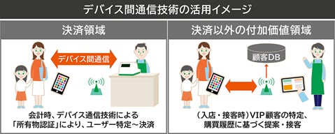 BLE(Bluetooth Low Energy)やUWB(Ultra Wide Band)等の通信技術を用いて、来店したお客さまが持っているスマートフォンと、店舗に設置された決済端末や各種IoTデバイスとの連携により、お客さまがスマートフォンの取り出しや画面起動といった操作を行わず、決済手続きが完了できるものです。バッグやポケットにスマホを入れたままでも、認証から決済手続き完了まで行う新たな決済体験を構築していきます。