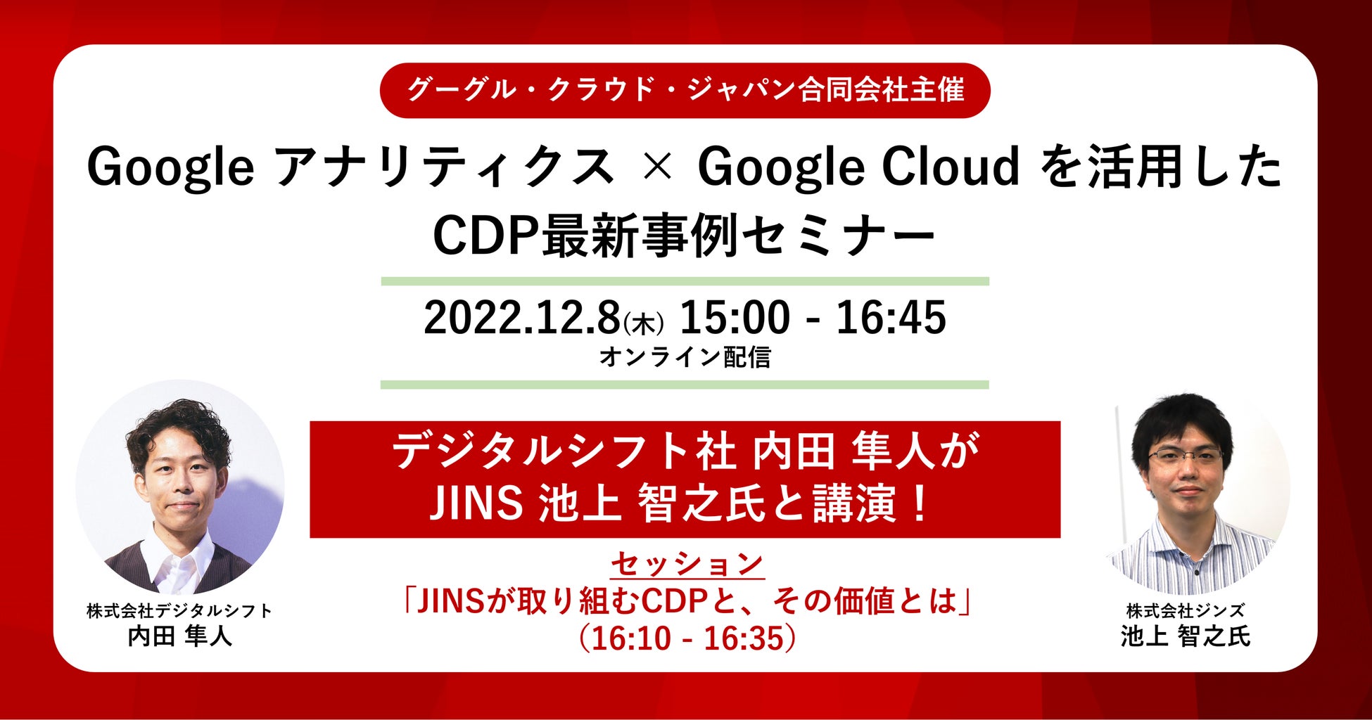 これまで、デジタルシフト社は事業分割前の株式会社オプトから約4年間にわたって、顧客体験向上のために Google Cloud※1 を活用したCDP(カスタマーデータプラットフォーム)※2を導入から活用までトータルで支援しています。本セミナーでは、プロジェクト開始当初のスモールスタートから、現在の全社的な活用に至るまでの支援実績に基づき、JINS様のデジタル本部 デジタル推進部 データ利活用推進室 池上 智之氏との対談形式でお届けいたします。