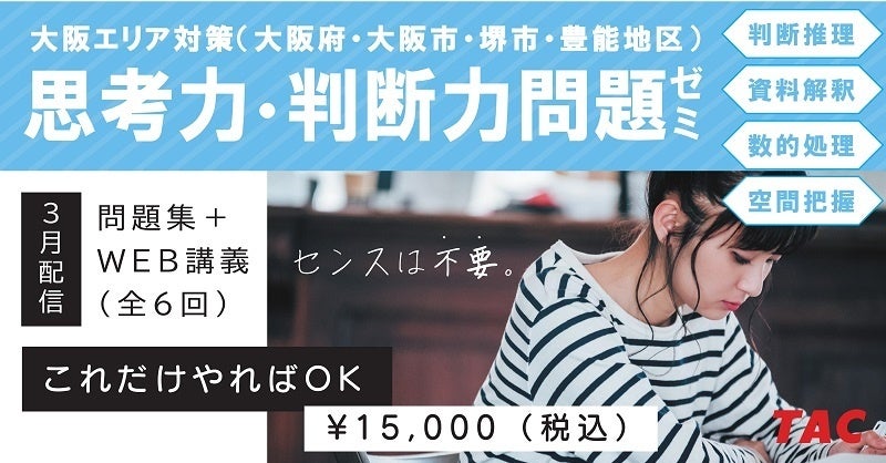大阪エリアでは、一次筆答テストとして、思考力や判断力を問う問題(数的処理・文章理解)が出題されます。例年、教職教養15題、思考力・判断力を問う問題15問の、合計30問で構成されますので、思判問題を捨て問とすることは得策ではありません。