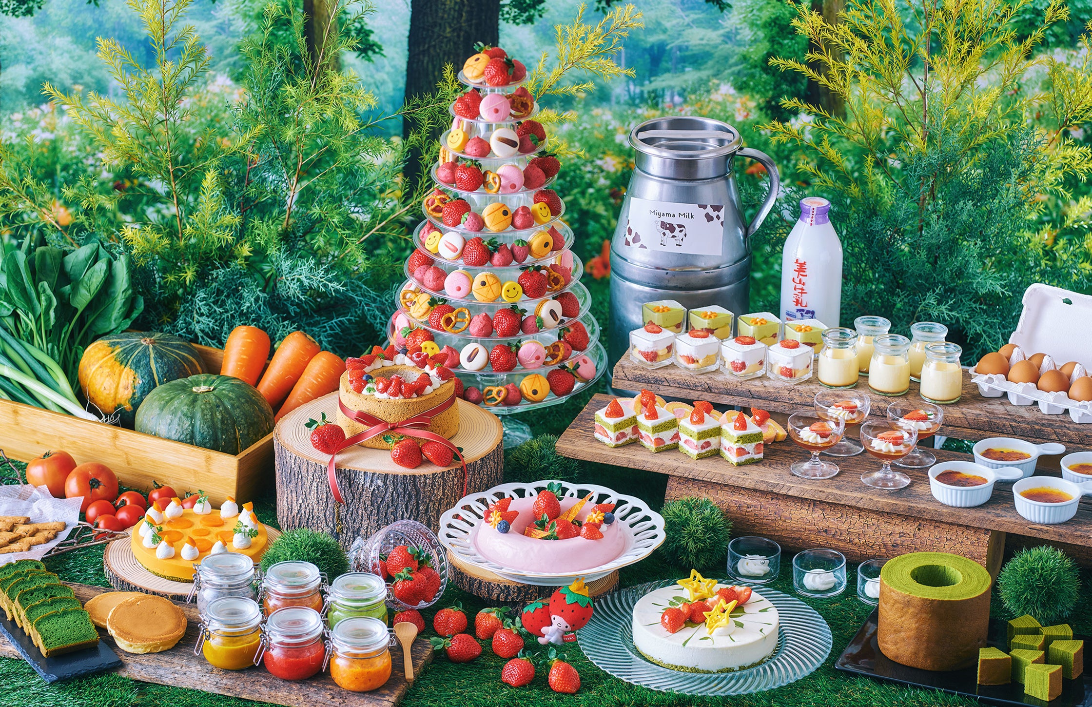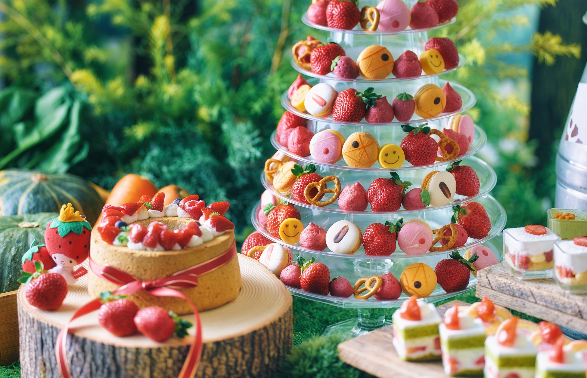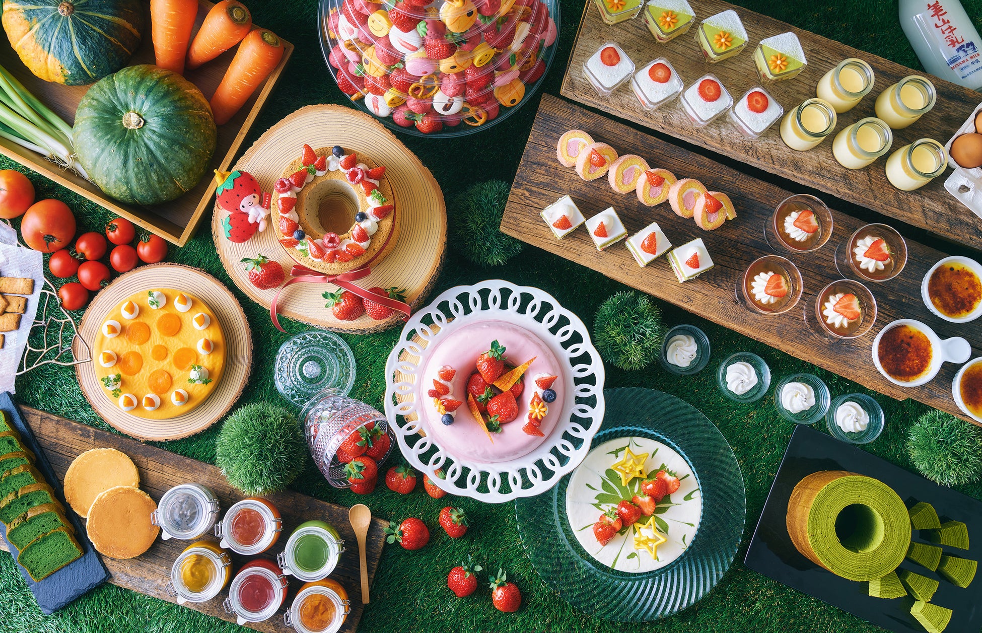 旬を迎えた、甘味と酸味のバランスが絶妙な福岡県産あまおうと、スイーツブッフェでは珍しく野菜がふんだんに使われた新作スイーツの数々をお楽しみください。京都らしい宇治抹茶や美山牛乳のスイーツ、セイボリーやサラダコーナーも充実のラインナップです。