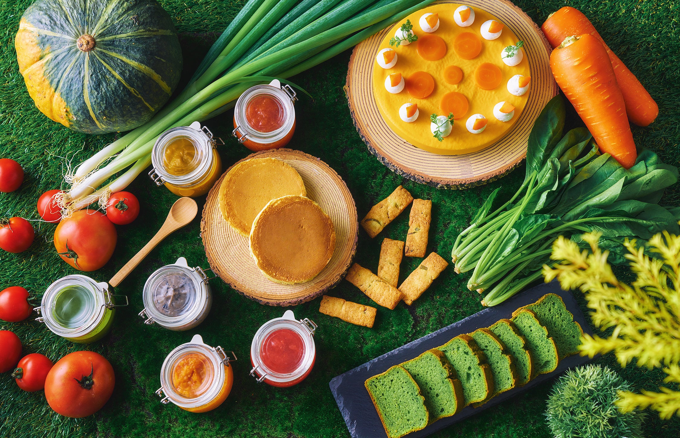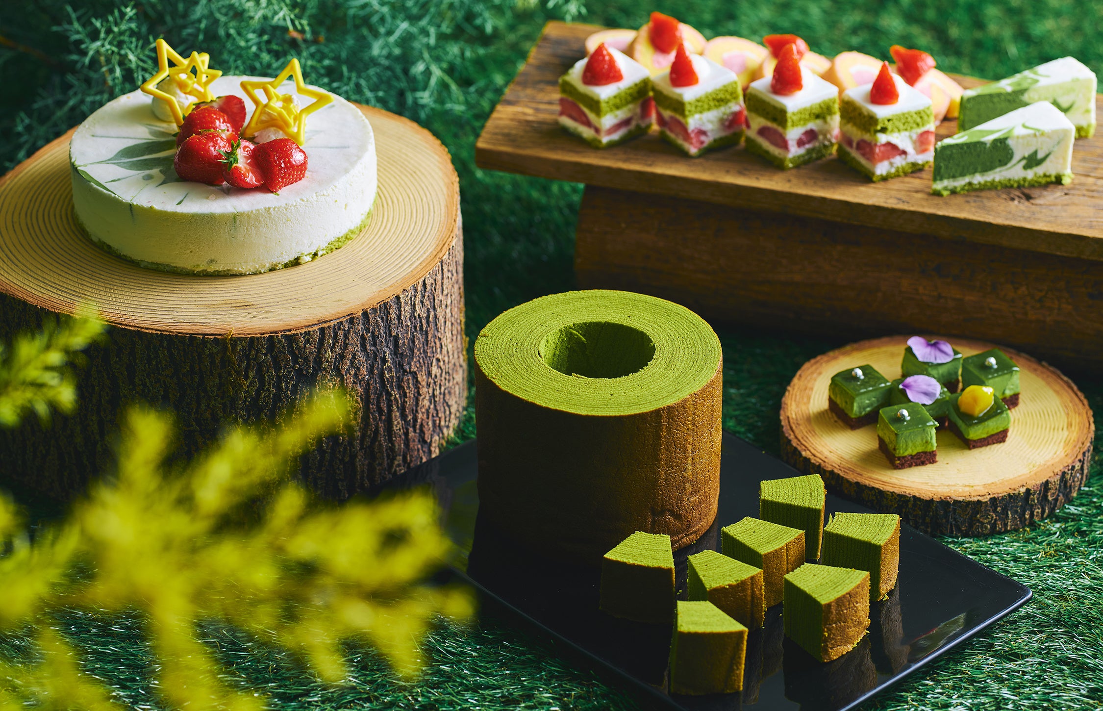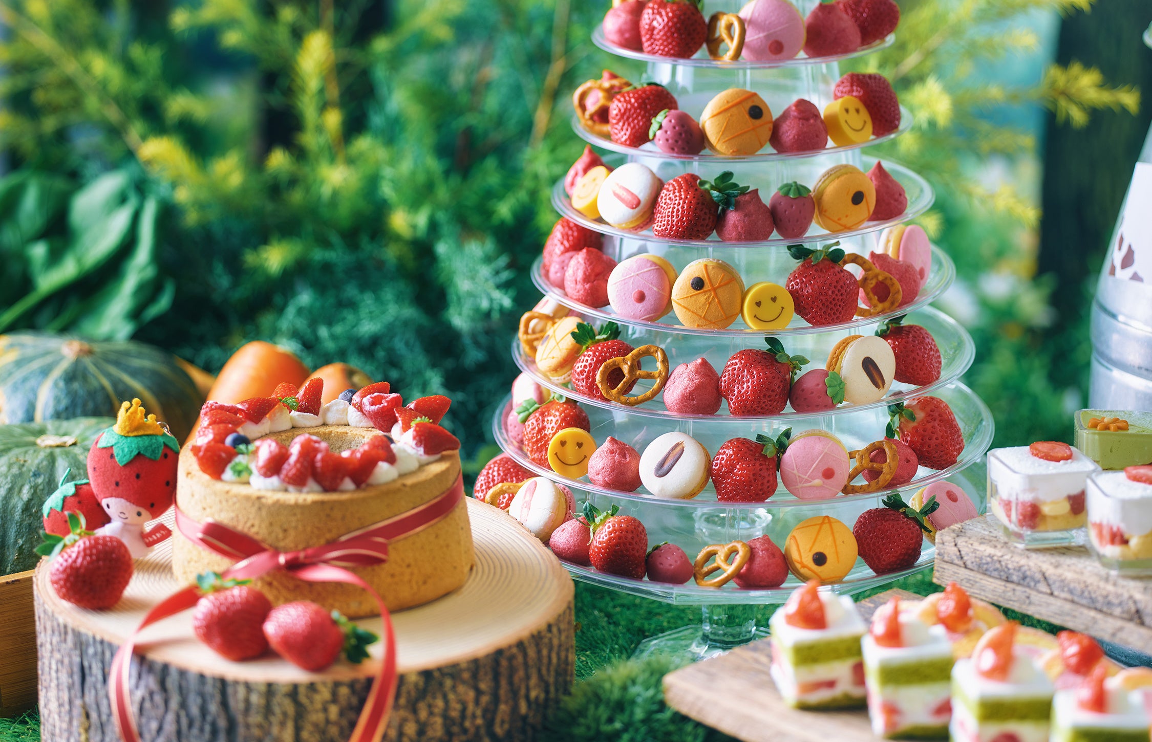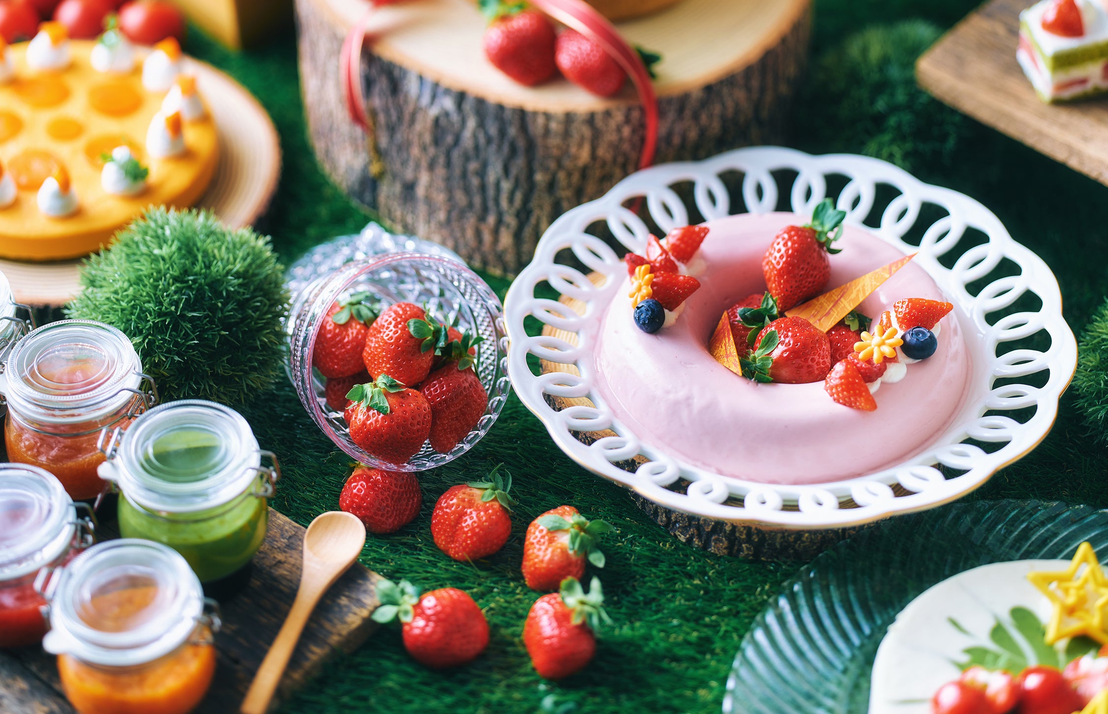 旬を迎えた、甘味と酸味のバランスが絶妙な福岡県産あまおうと、スイーツブッフェでは珍しく野菜がふんだんに使われた新作スイーツの数々をお楽しみください。京都らしい宇治抹茶や美山牛乳のスイーツ、セイボリーやサラダコーナーも充実のラインナップです。