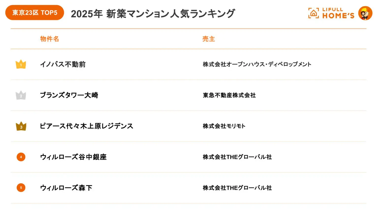 株式会社オープンハウスグループ(本社 東京都千代田区、代表取締役社長 福岡 良介、以下「当社」)のグループ会社である株式会社オープンハウス・ディベロップメントは、株式会社LIFULL(本社:東京都千代田区、代表取締役社長:伊東祐司、東証プライム:2120)が運営する不動産・住宅情報サービス「LIFULL HOME'S(ライフルホームズ)」が実施した「最新版!2025年 新築マンション人気ランキング」で、当社の新築分譲マンション「イノバス不動前」が全国1位に選出されましたことをお知らせいたします。