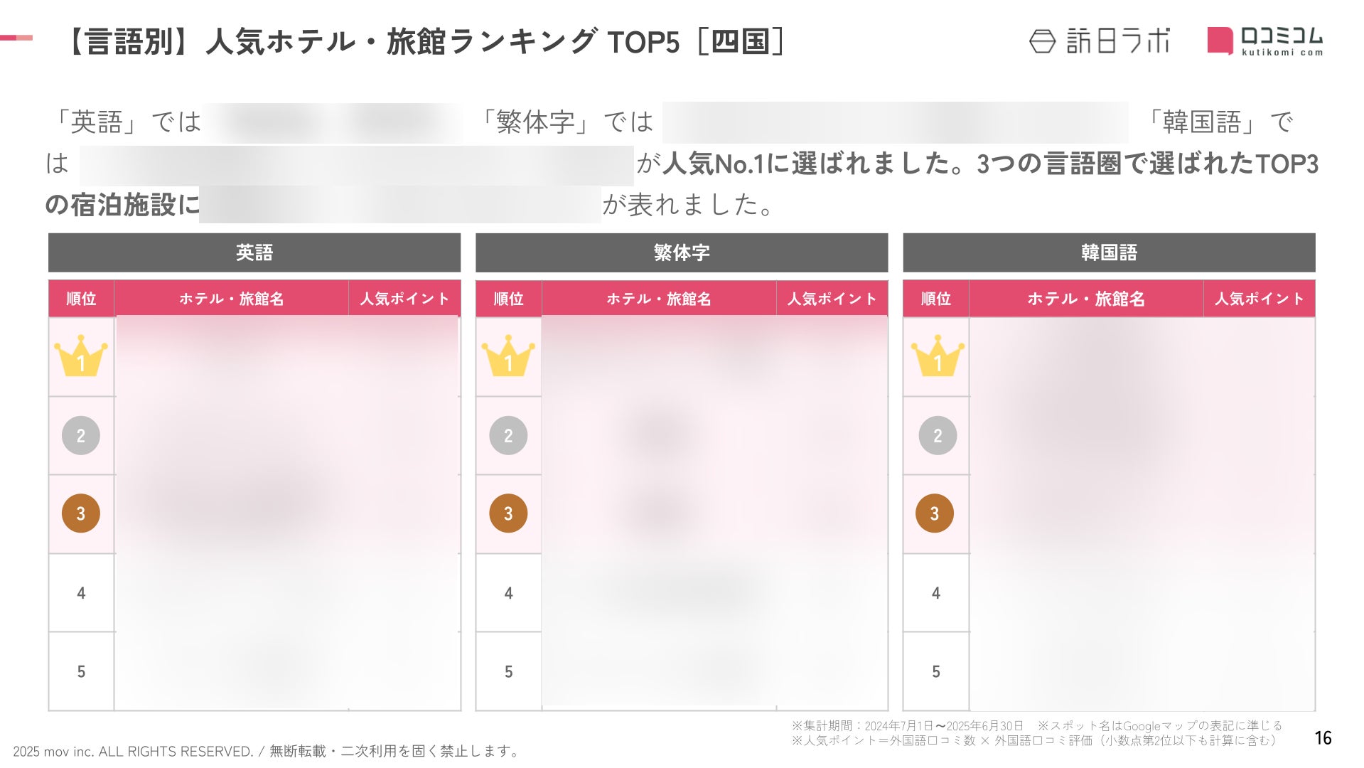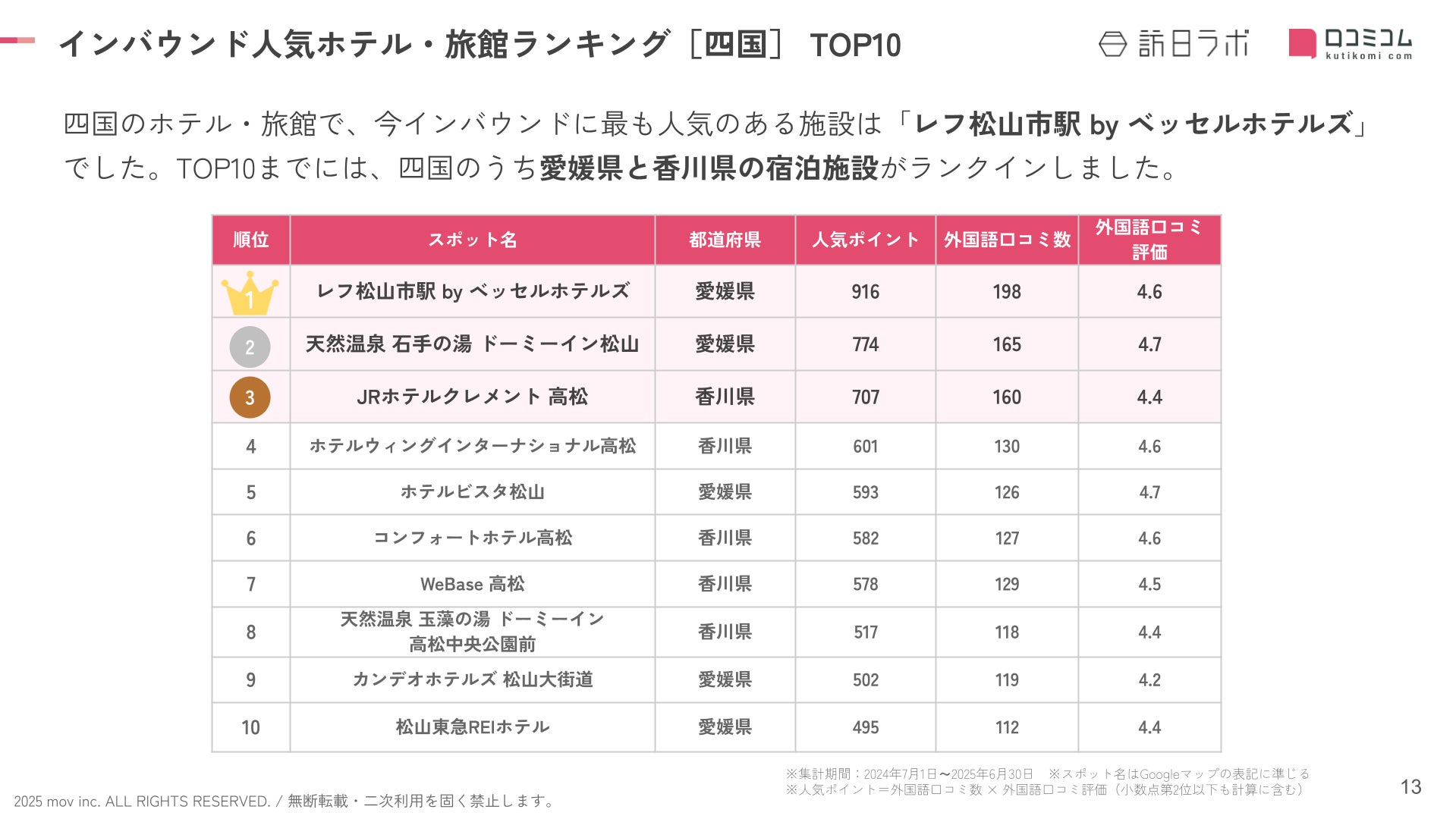 業界最大級のインバウンドビジネスメディア「訪日ラボ」及び 店舗向け集客一元化プラットフォーム「口コミコム」を運営する株式会社mov(代表取締役:渡邊 誠、本社:東京都渋谷区、以下mov)は、四国(愛媛・香川・徳島・高知)のホテル・旅館に寄せられた最新の口コミデータから、独自の『インバウンド人気ホテル・旅館ランキング』を発表しました。