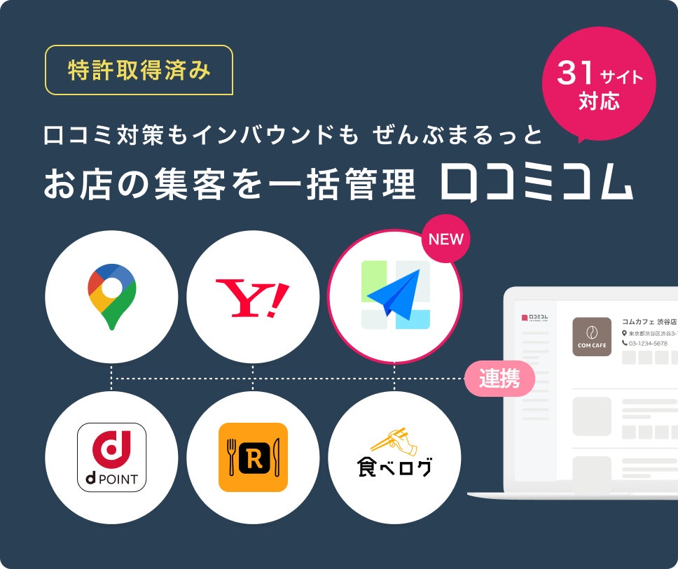 口コミコムは、国内外の口コミサイトを“もっと”売上に変える「店舗向け集客一元化プラットフォーム」です。