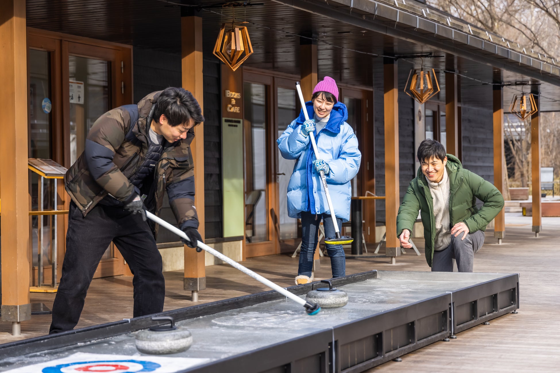 全⻑5mの特設アイスリンクにあるハウスを目掛けて約10kgのミニストーンを滑らせ、ブラシでスイープする体験ができます。