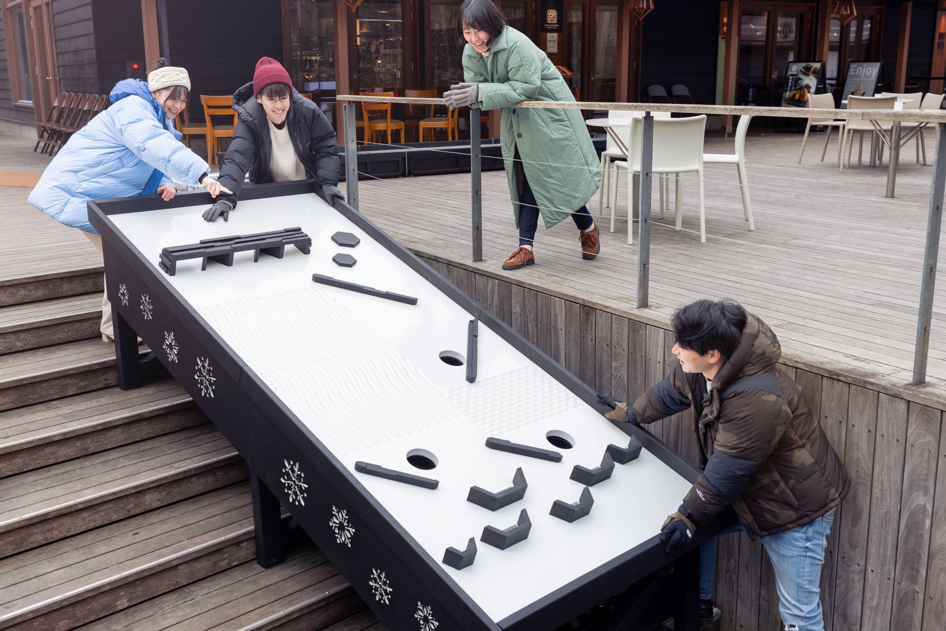 デッキの階段に沿って、幅120cm・⻑さ250cmの大きなピンボール盤が登場します。勢いよく滑る氷の思いがけない動きで点数を競います。