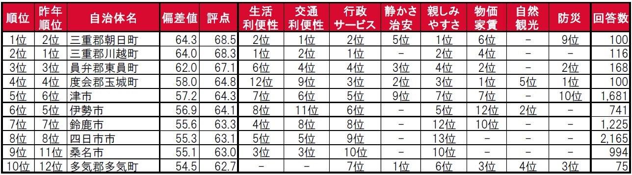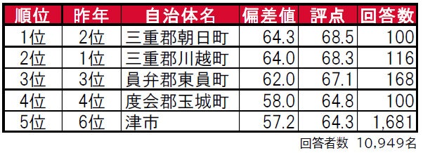 住みここちは、1位三重郡朝日町、2位三重郡川越町。3位は3年連続で員弁郡東員町。