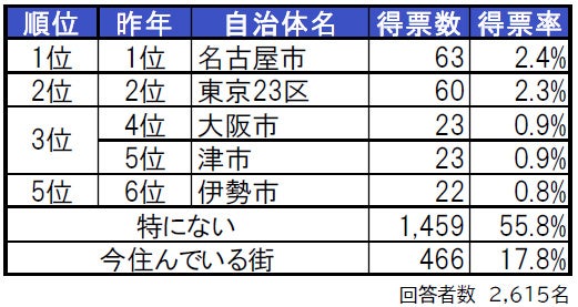 名古屋市が、2年連続で1位に輝きました。2位は東京23区、3位は大阪市で、東海以外の自治体が続いています。伊勢市が昨年6位から順位を上げて、5位です。