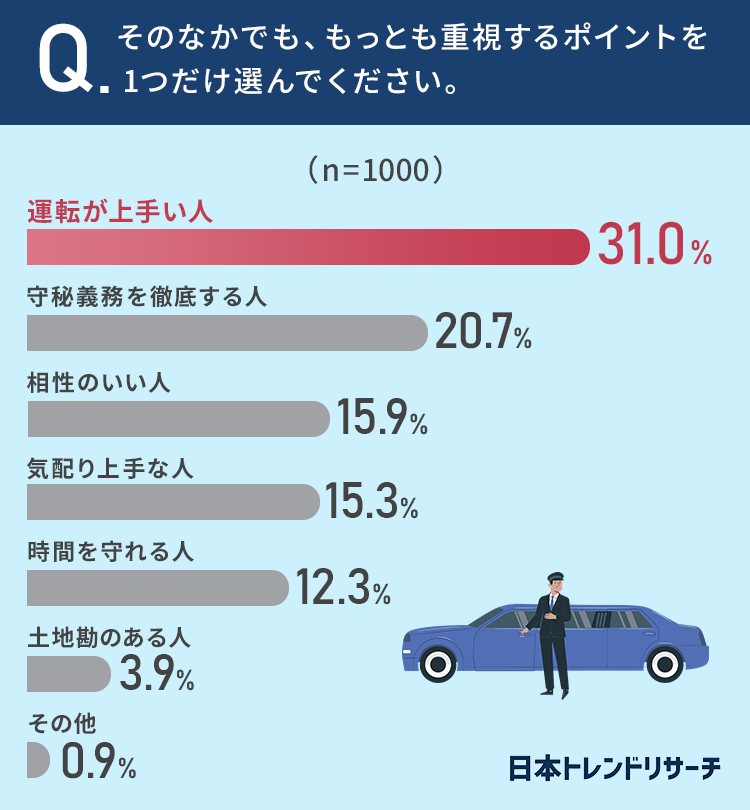 「専属運転手を雇うとしたら」でもっとも人気なのは「運転が上手い人」で、31%でした。