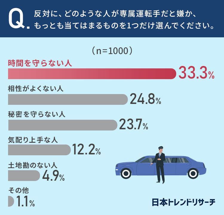 「反対に、どのような人が専属運転手だと嫌か?」といった問いには「時間を守らない人」がもっとも多く選ばれていました。