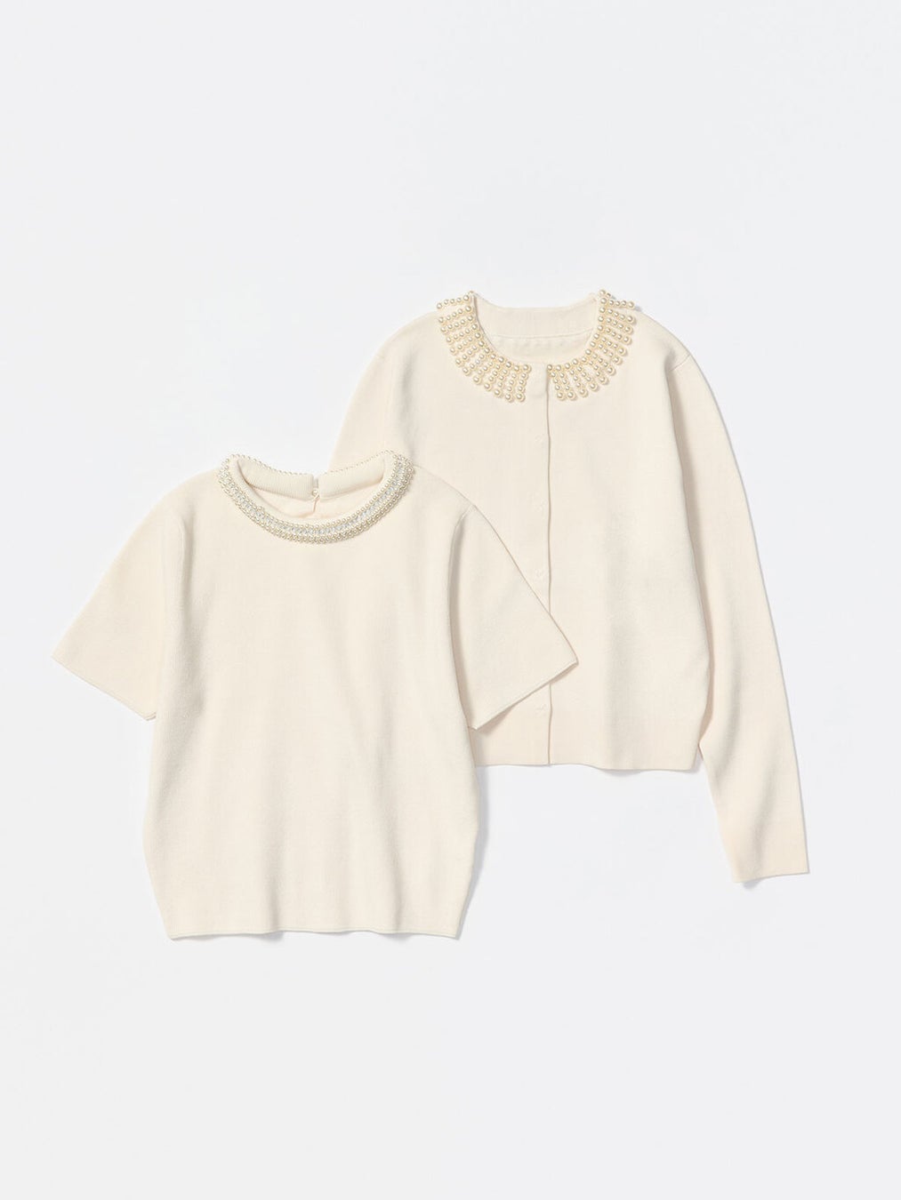 大胆にあしらったパールが襟元で美しく映えるニット。デイリーからお仕事まで幅広いシーンで活躍する、ホワイトとネイビーの2色をご用意しました。