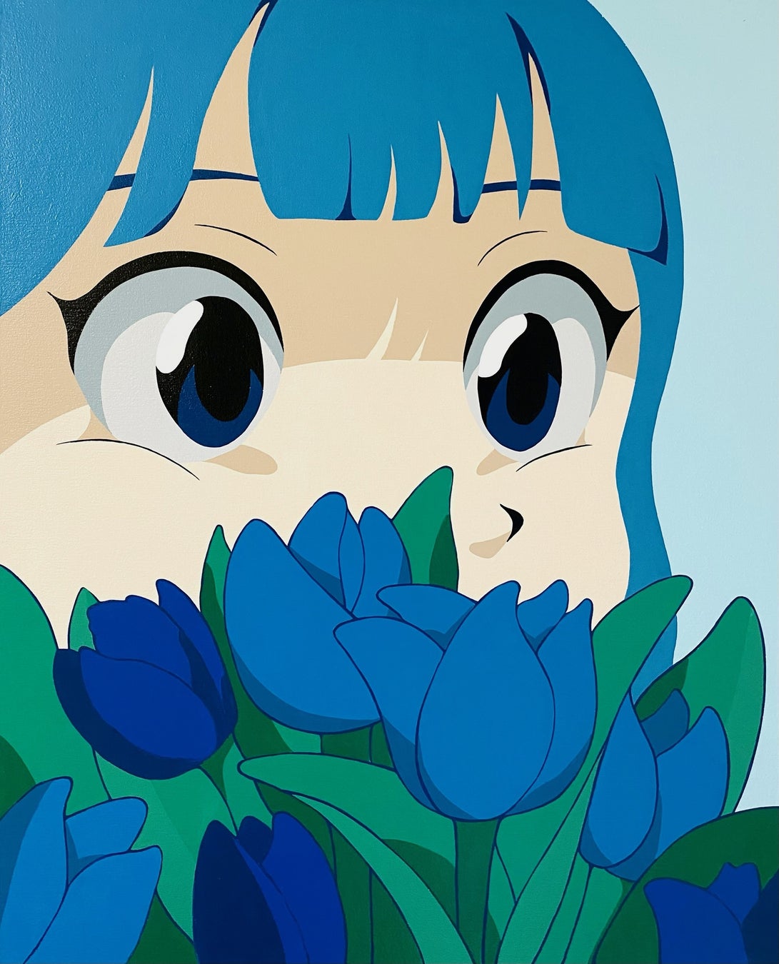 本展では、新作キャンバス作品11点を展示します。メインビジュアル作品は、作家がかねてより持っていた“花を好きな女性が多いのはなぜだろう”という疑問から、作品を通して女性が本質的にもつ何かを描こうとしています。