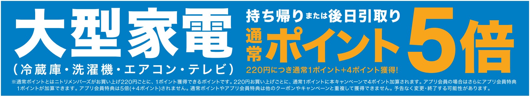 期間中は、冷蔵庫・洗濯機・テレビ・エアコンなどの⼤型家電を、ご自身でお持ち帰りいただいたお客様に(後日引き取り含む)、ご購入いただいた大型家電の通常ポイントが5倍になるお得なキャンペーンとなっています(※3)。
