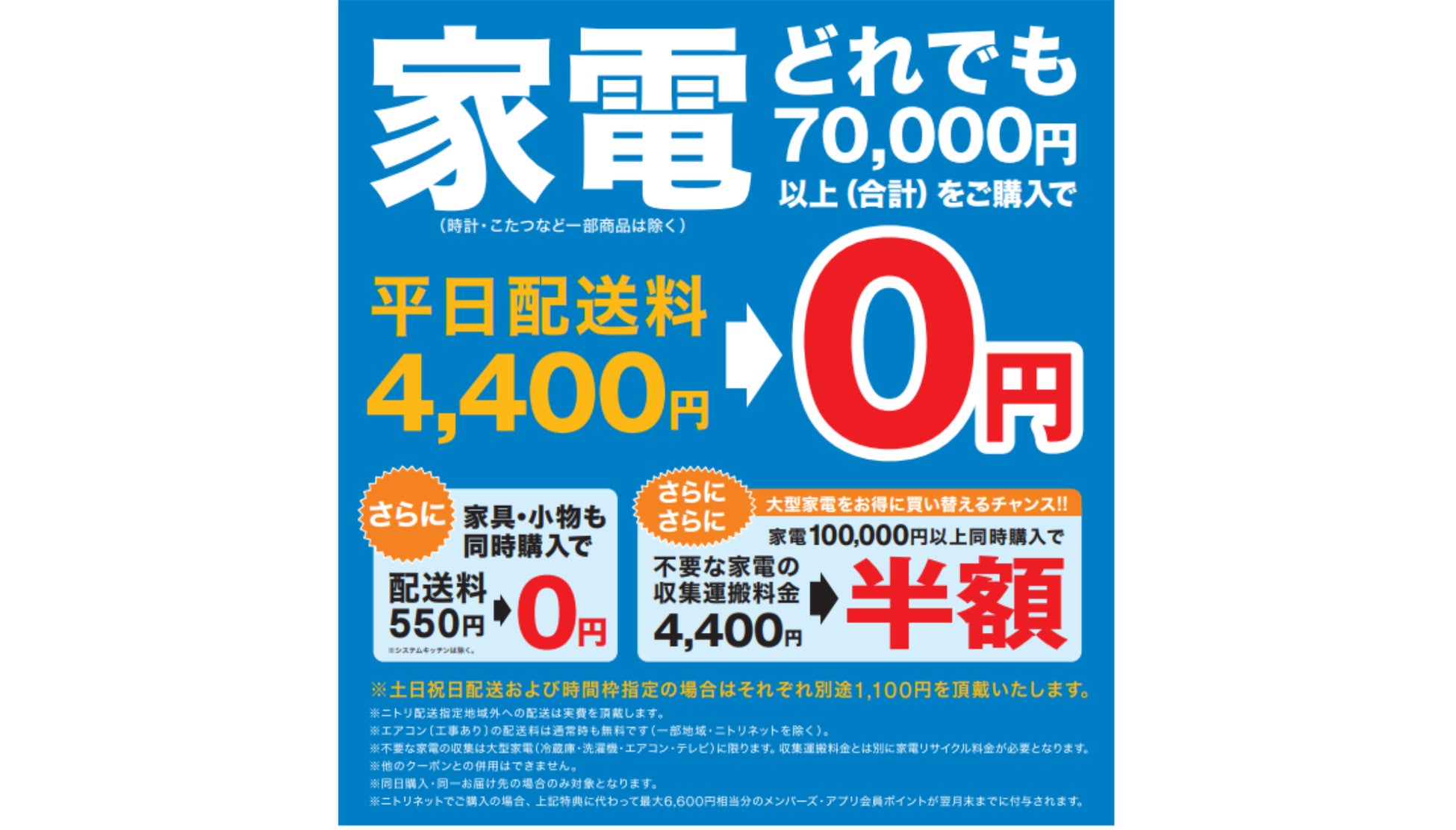 このたびニトリでは、1⽉7⽇(火)〜4⽉7⽇(月)の期間限定で「家電キャンペーン」を開催いたします。期間中に店舗で家電(時計・こたつなど一部商品は除く)を税込み合計で70,000円以上ご購⼊いただくと、平日配送料⾦(通常4,400円(税込))が無料となります。さらに家具(システムキッチンは除く)と生活雑貨も同時購入いただき一緒に配送すると、通常550円(税込)のところ、期間中はこちらも無料となります。全部まとめて配送料無料で届くので大変便利です。