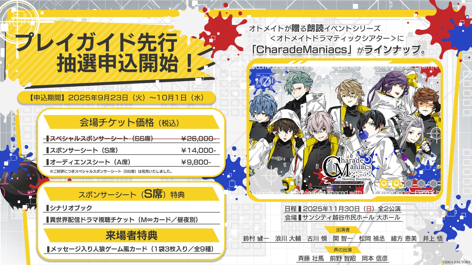 アイディアファクトリー株式会社(代表取締役社長:佐藤 嘉晃/所在地:東京都豊島区)の女性向けゲームブランド「オトメイト」は、2025年11月30日(日)にサンシティ越谷市民ホール 大ホールにて開催する、オトメイトドラマティックシアターvol.05「CharadeManiacs -Howling Deception-」の本公演朗読劇あらすじ、スペシャルスポンサーシート(SS席)の特典内容詳細を公開いたしました。