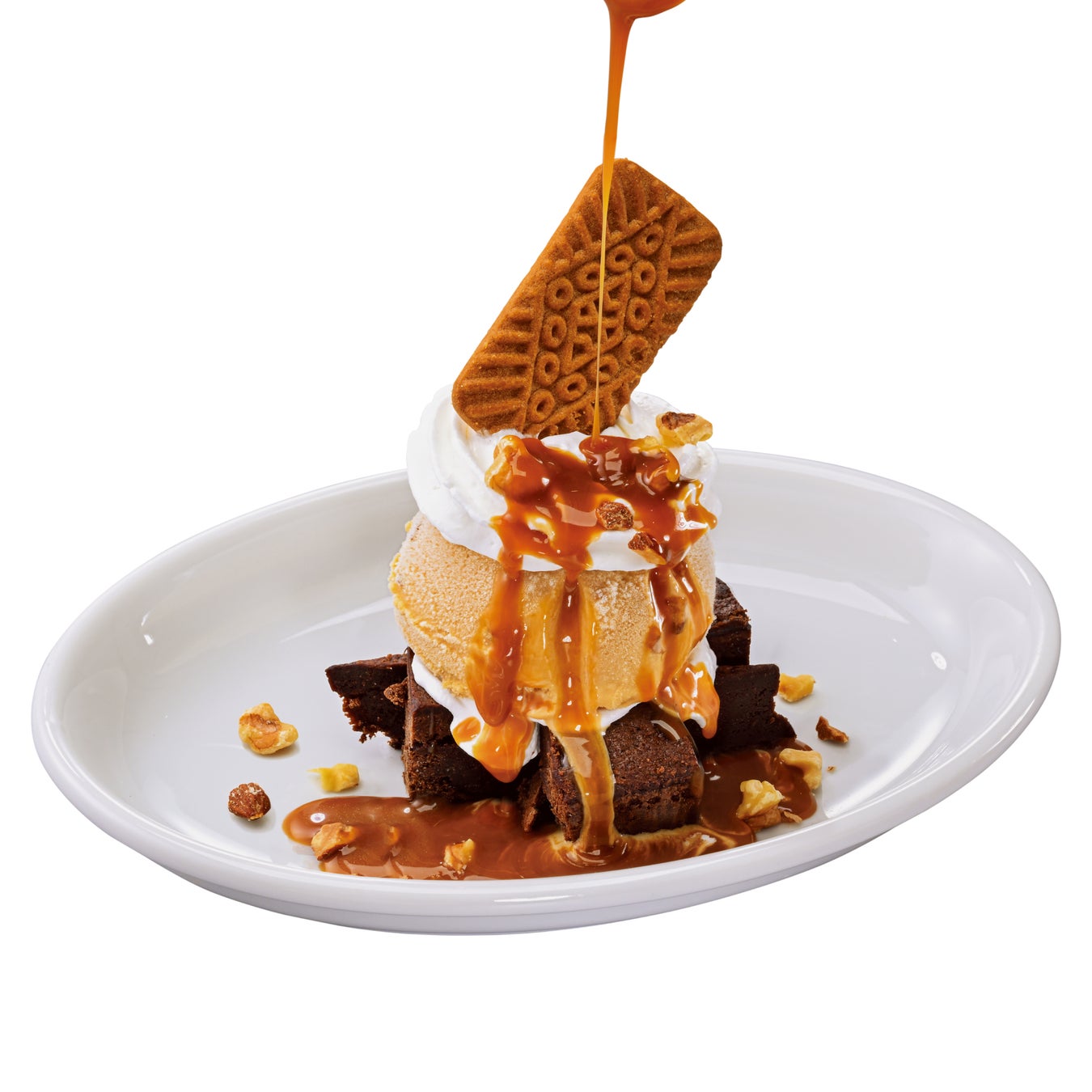 「ブラウニー塩キャラメルファッジサンデー」は、ほんのり温かいブラウニーに、塩キャラメルアイス、ホイップ、ナッツなどをのせたデザートです。温かいブラウニーと冷たいキャラメルアイスの絶妙なマリアージュをご堪能いただけます。別添えでご提供する温かくほろ苦いキャラメルソースをかけて、より濃厚な味わいをお楽しみください。