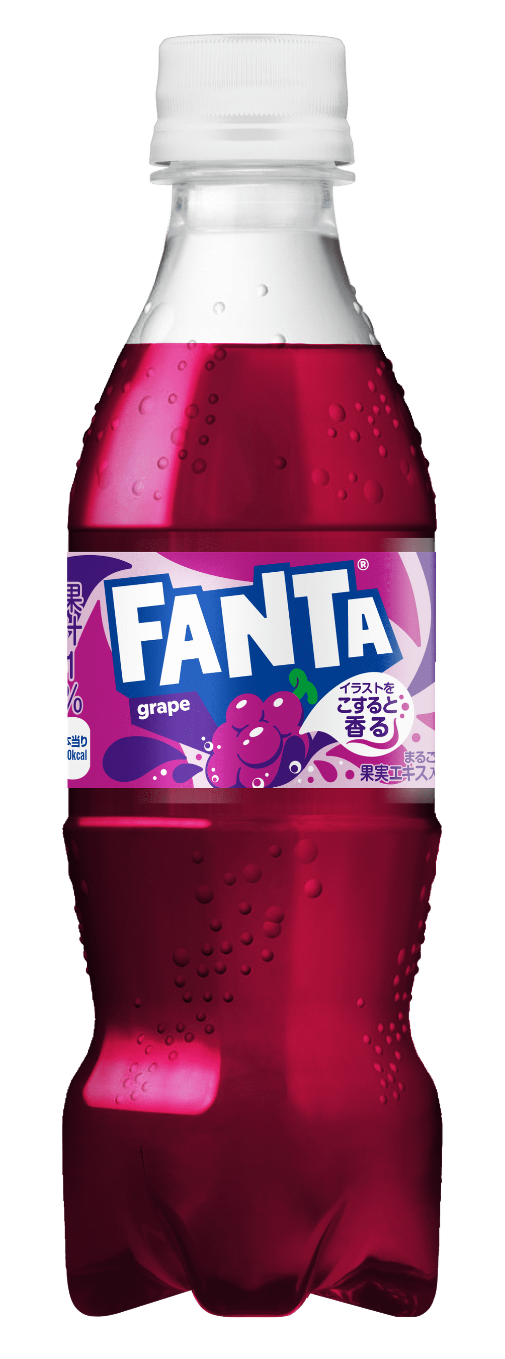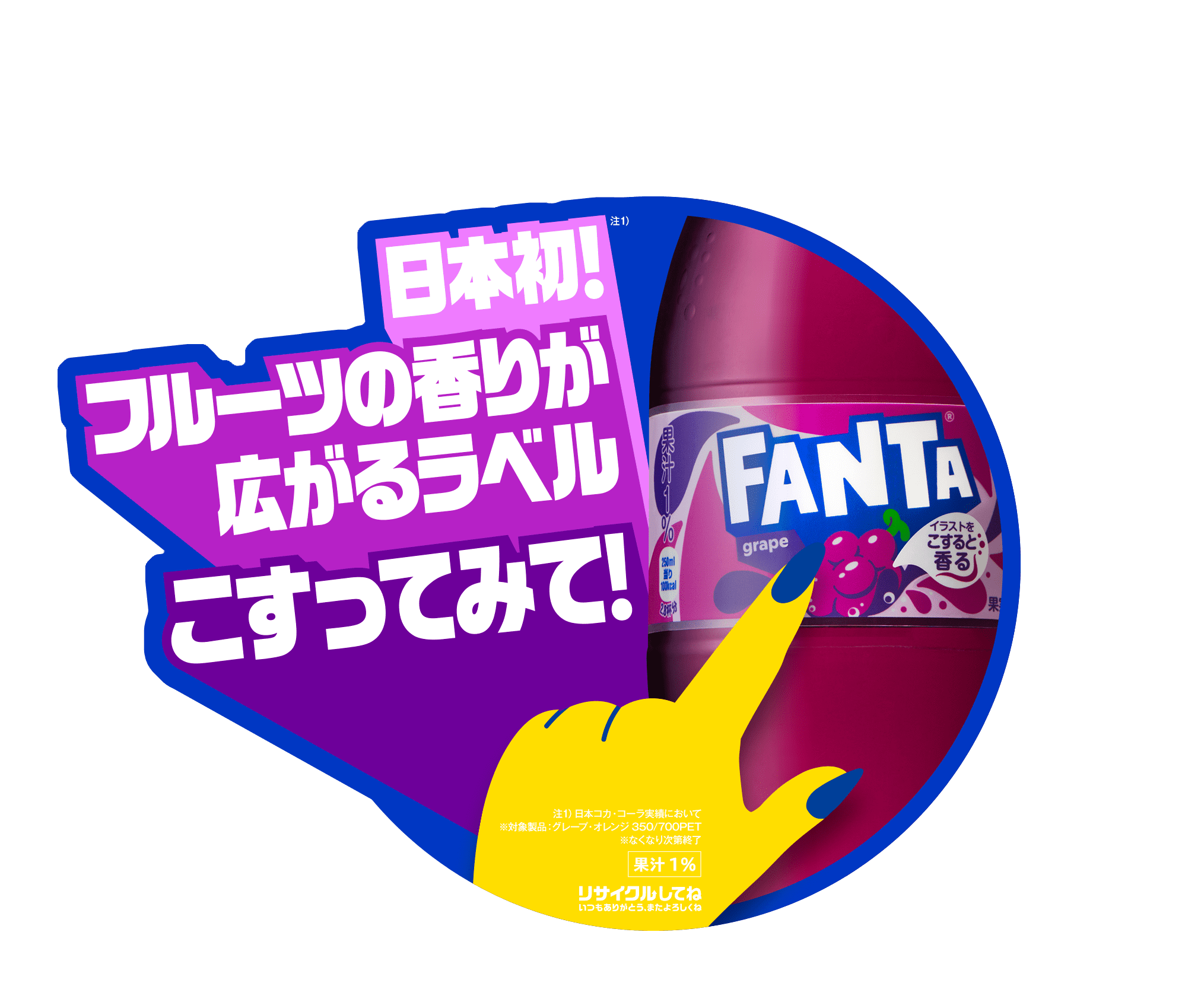 そして、パッケージは「ファンタ」のハジける楽しさを全面で表現する、よりポップなデザインに進化しました。さらに、4月8日(月)から6月30日(日)の期間限定で、一部対象製品では、“日本初”※3となる「香り付きラベル」を展開します。パッケージに描かれたフルーツのイラストを擦るとグレープとオレンジのイラスト部分からフルーツの香りが感じられる仕組みが施された期間限定デザインとなっています。ぜひこの春は、友人や家族と一緒に「ファンタ」を五感でお楽しみください。