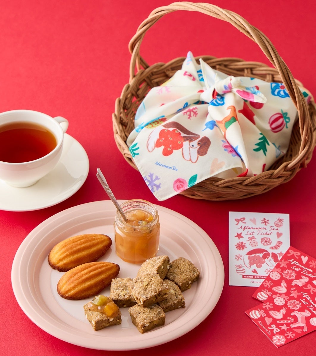 店内メニュー「アフタヌーンティーセット」のバスケットに紅茶と焼き菓子を詰め合わせた、ご自宅で楽しめるアフタヌーンティーのクリスマス限定のセット。店内メニューの「アフタヌーンティーセット」をご利用いただけるチケット2枚付きです。