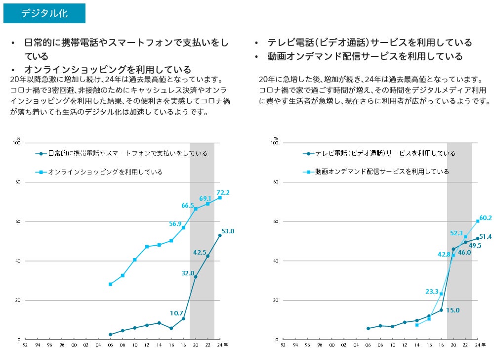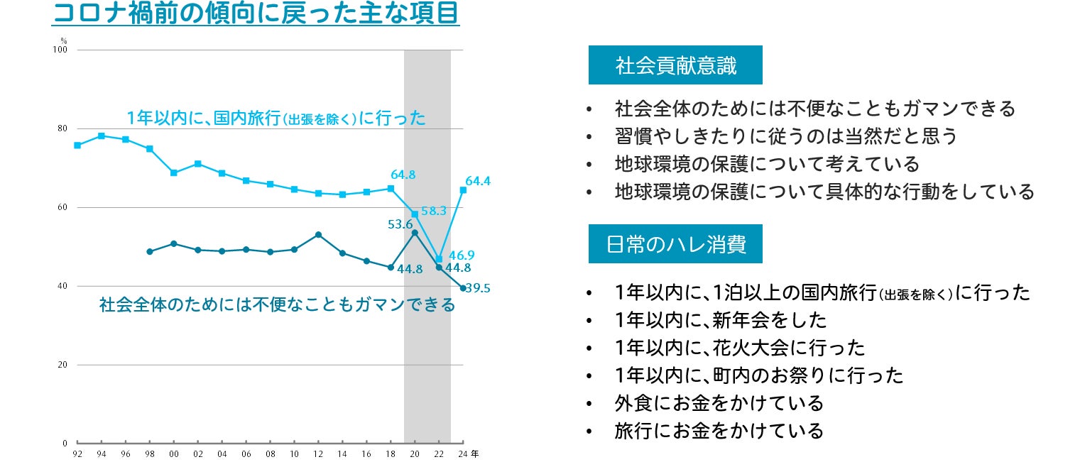 コロナ禍前後の2018年-2024年における変化に着目 コロナ禍前の傾向に戻った「社会貢献意識」「日常のハレ消費」新たに定着した「デジタル化」「ひとり志向」