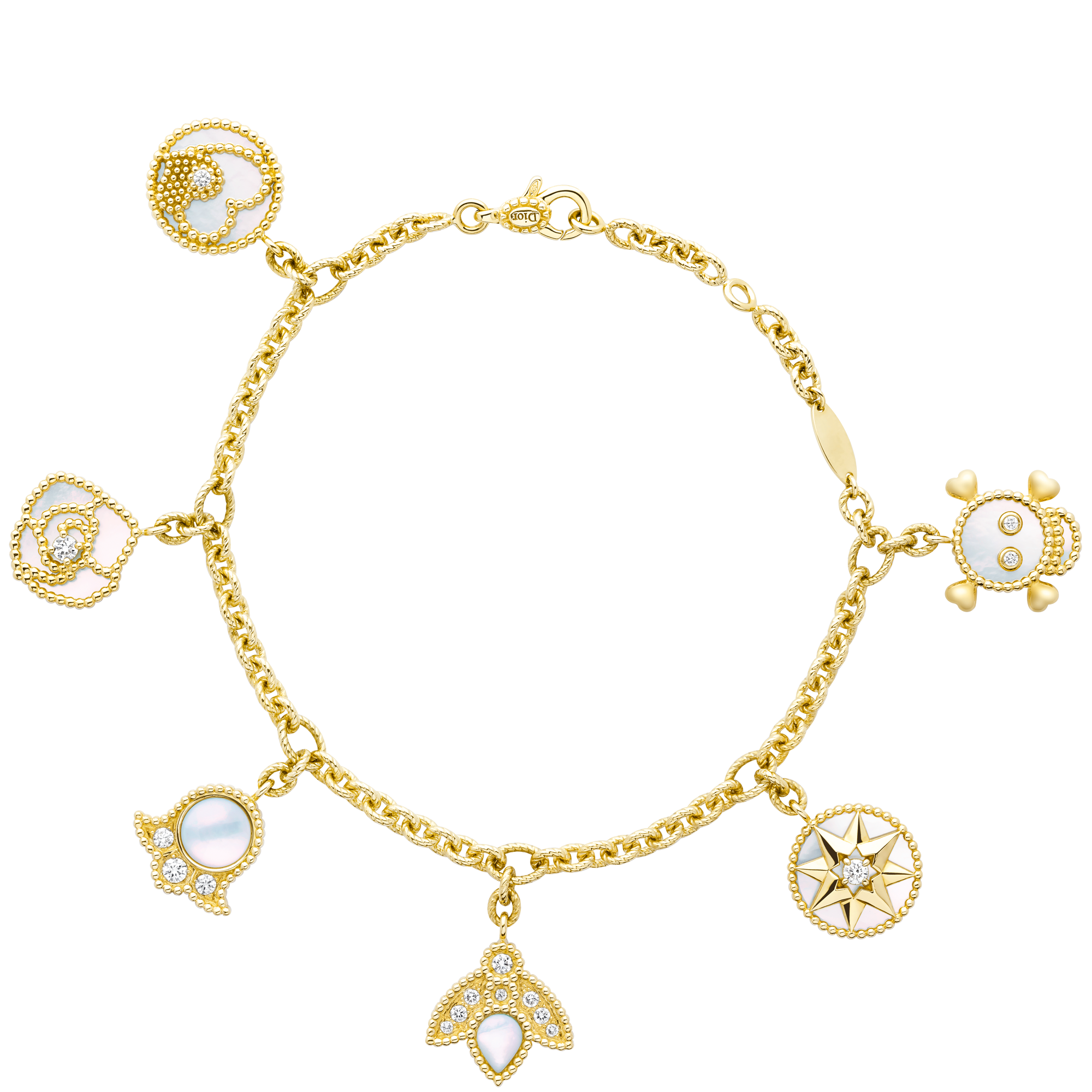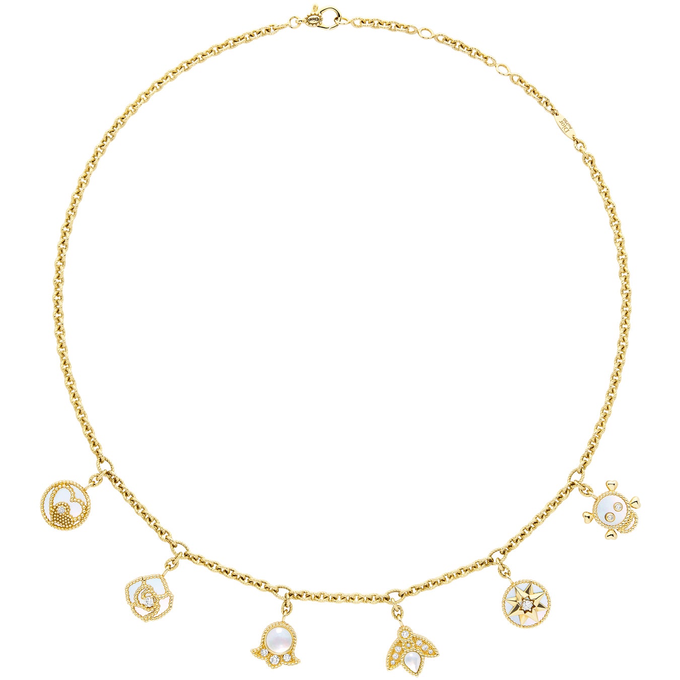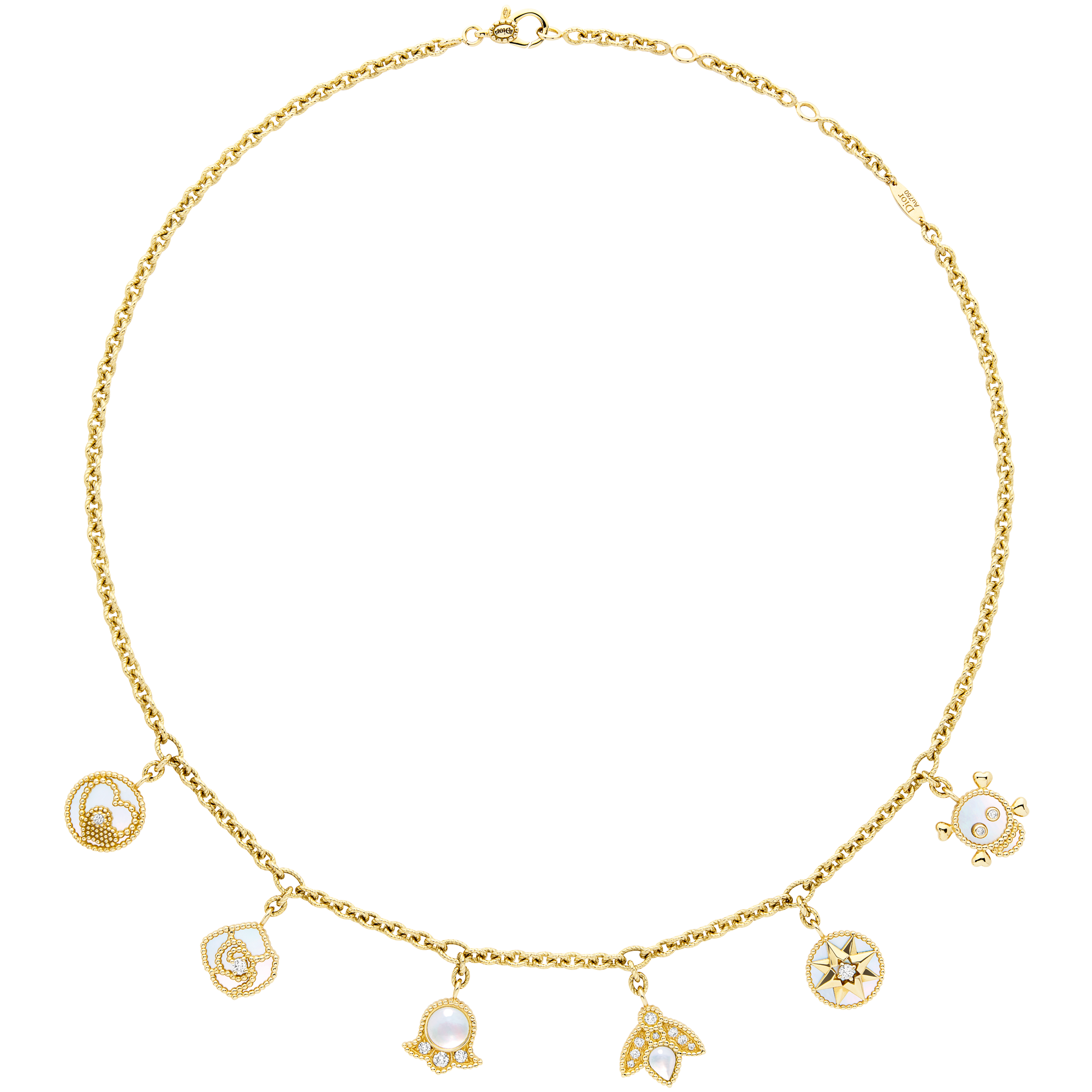 2022年11月、ホワイトマザーオブパールを彫り出した薔薇、ミツバチ、ファッションショーの日にその小枝をドレスの裾に縫い込んでいたスズランなどムッシュ ディオールお気に入りのモチーフのほか、ダブルハートやスカルのモチーフのチャームを配した新作「ローズ デ ヴァン チャーム」が登場します。ローズ デ ヴァンとともにラッキーチャームを集結させたネックレスとブレスレットは、まるでお守りのようです。ミツバチとスズランを模したシングルイヤリングも取りそろえます。