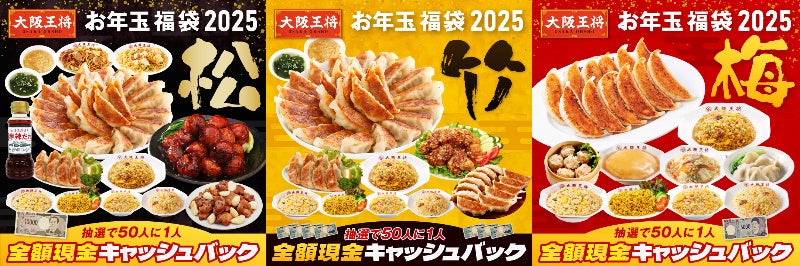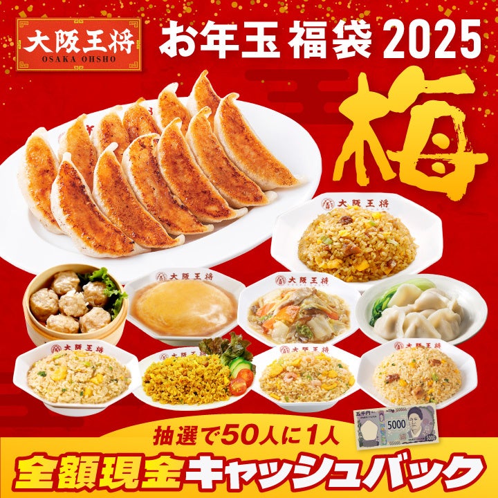 「大阪王将 お年玉福袋」各種のいずれかをご購入いただいた方の中から、それぞれ抽選で50人に1人の確率で、ご購入代金(最大10,000円)を全額現金でキャッシュバックするキャンペーンです。
