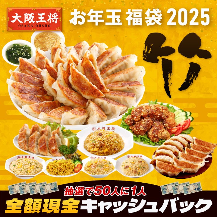 イートアンドグループで冷凍食品販売のEC事業を手がける株式会社ナインブロック(所在地:大阪府大阪市 代表取締役社長:髙塲秀樹)は、2024年11月29日(金)より、大阪王将公式通販サイト( http://o-ohsho.jp/ )にて「大阪王将 お年玉福袋 2025」を販売いたします。さらに、ご購入いただいた方の中から抽選で50人に1人の確率で、ご購入代金(最大10,000円)が全額現金でキャッシュバックされるキャンペーンを実施いたします。