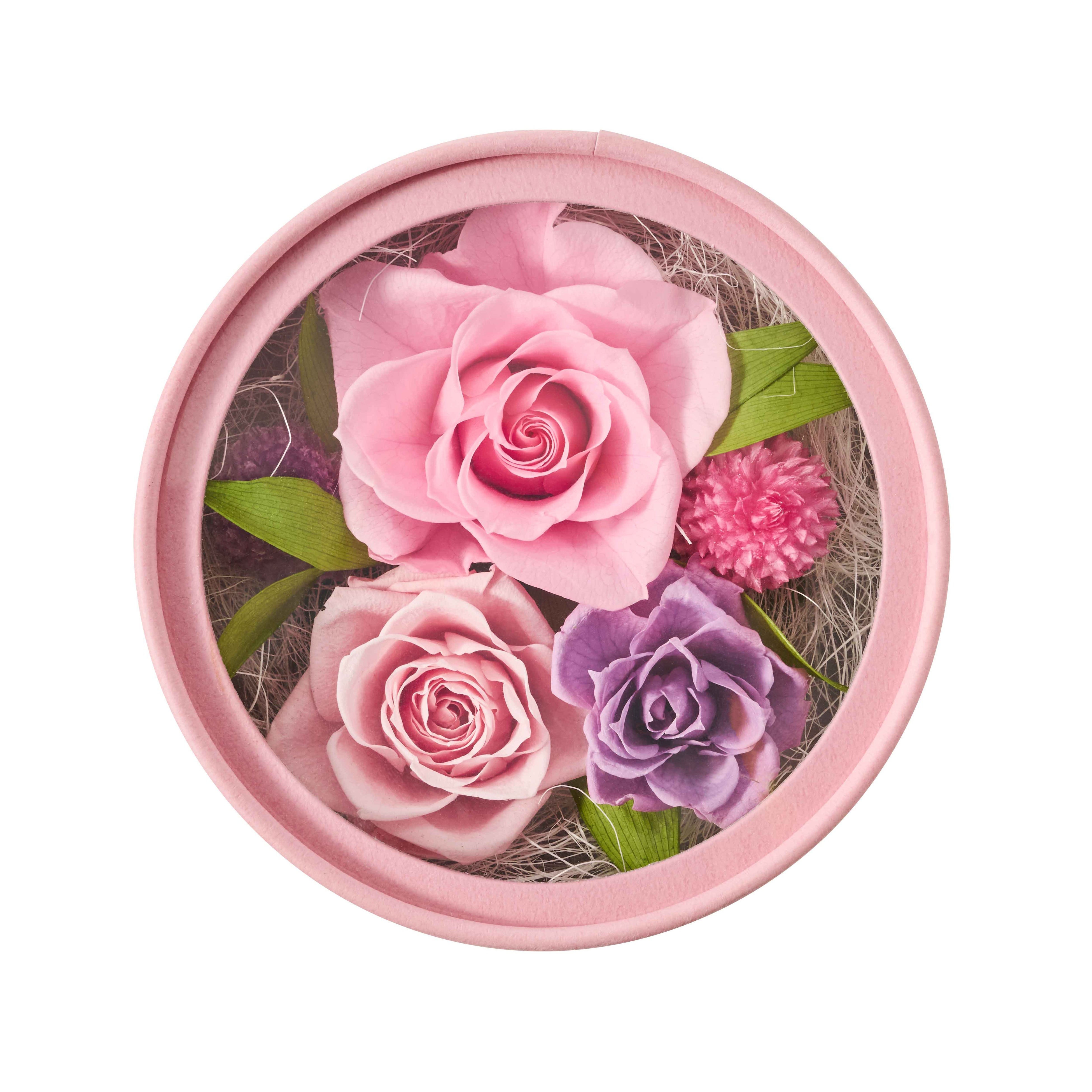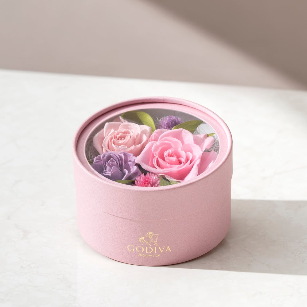 春らしい色とりどりの花を表現したフラワー形のパッケージの心躍るチョコレートの詰め合わせと、3色のローズで感謝の気持ちを表したプリザーブドフラワーボックスをセットしました。