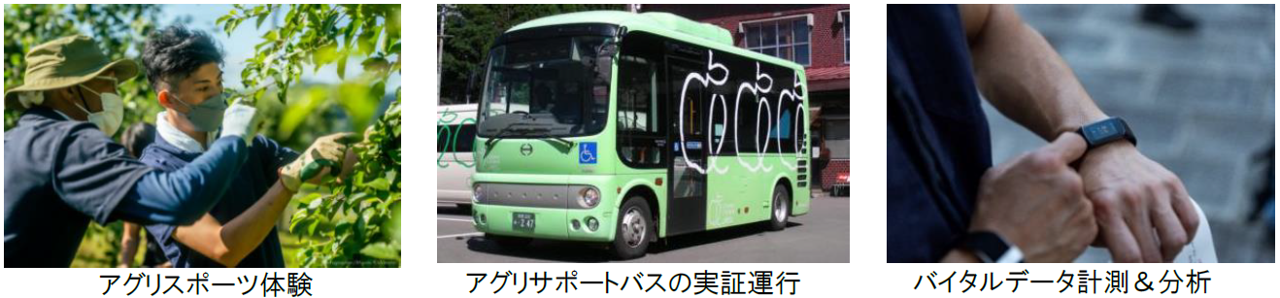 ◆各自ウェアラブル端末を装着しバイタルデータデータ計測&後日分析 ・ウェアラブル端末を使用しバイタルデータを計測する。 ・奈良県立医科大学MBT研究所は地域医療の観点から、アシックスはスポーツ医学の観点からそれぞれバイタルデータを分析し、健康経営支援における効果及び成果を定量的に検証する。 ◆アグリサポートモビリティ(バス及びE-BIKE)の実証運用による移動支援実施 ・2次交通として「アグリサポートバス」を実証運行し、北陸新幹線飯山駅から飯綱町地域拠点までの移動および農業体験への参加意欲向上を促す。 ・3次交通として「E-BIKE」を実証運用し、飯綱町地域拠点から連携する農業法人までの移動と心身のリフレッシュ、地域接点の創出を促す。 ◆フィールドワーク&ワークショップ ・「アグリスポーツワーケーション」を健康経営支援向けに設計したメニューを体験。 |