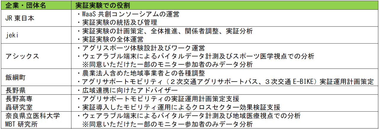 ○東日本旅客鉄道株式会社(本社:東京都渋谷区、代表取締役社長:喜㔟 陽一、以下 JR東日本)、株式会社ジェイアール東日本企画(本社:東京都渋谷区、代表取締役社長:赤石 良治、以下 jeki)、株式会社アシックス(本社:兵庫県神戸市、代表取締役社長COO:富永 満之、以下 アシックス)、長野県飯綱町(町長:峯村 勝盛)、長野県(県知事:阿部 守一)、独立行政法人国立高等専門学校機構長野工業高等専門学校工学科都市デザイン系轟研究室(代表:轟 直希、以下 長野高専轟研究室)、公立大学法人奈良県立医科大学(理事:嶋 緑倫、以下 奈良県立医科大学MBT研究所)は、「農業×スポーツ×移動×デジタル」により中山間地農業のポテンシャル拡大を目指す「アグリスポーツ健康経営」実証実験(以下、本実証)を行います。 ○健康経営を目的とした企業研修利用を想定し、首都圏や近郊で働く人たちを実証モニター対象とし、首都圏と地方の移動を創出させます。また、農業をスポーツととらえ、農作業を通して活動者の心身に与える影響をスポーツ科学の観点から分析する「アグリスポーツ™ワーケーション※1」を長野県飯綱町で体験することで、ワーケーションを推進するとともに地場産業活性化と企業の健康経営支援を両立し同時解決できるかを検証します。 ○本実証は、地場産業活性化を目指す地方自治体と健康経営を志向する企業の相互共創関係を生み出し、新幹線移動及び地域周遊需要拡大、多面的な農業支援による交流・関係人口の創出、Well-beingな社会実現を目指すもので、JR東日本が設立した「WaaS共創コンソーシアム※2」における産官学連携による地域共創の実証実験の一環として実施します。 |