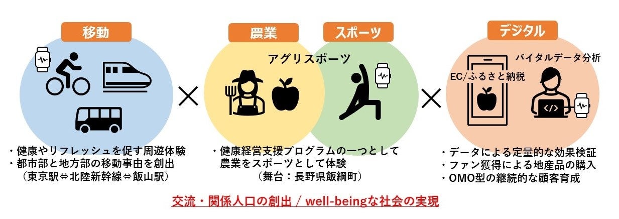 農林水産省が提示する「農業」が持つとされる“安らぎや健康、学び(Well-being)”を創出する多面的機能※3や「スポーツ」が持つ個と集団に健全な身体と精神の形成を促す機能、「移動」が持つ越境や交流、発見を促す機能を活用した企業従事員の健康経営支援メニューの開発を目指します。