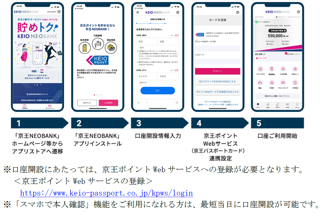 本サービスでは、スマートフォンに「京王NEOBANK」アプリをインストールして必要情報を入力することで、手軽かつスピーディーに銀行口座を開設することができ、住信SBIネット銀行が提供する預金や振込、ATMなどの銀行サービスをスマートフォン1つでご利用いただけます。また、本サービスは京王パスポートカード会員を対象としており、銀行サービスのご利用、住宅ローンの借入等により、京王グループをはじめとする京王沿線約750店舗で使える京王ポイントが貯まります。