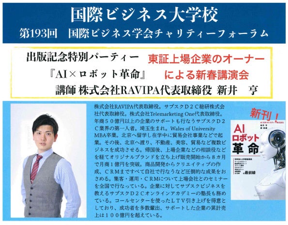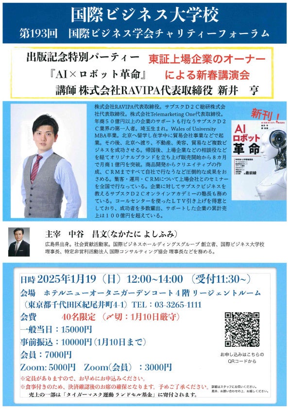 【先着40名限定】第193回国際ビジネス学会チャリティーフォーラムに株式会社RAVIPA代表取締役の新井亨が講師として登壇決定|2025年1月19日(日)【AI×ロボット革命】
