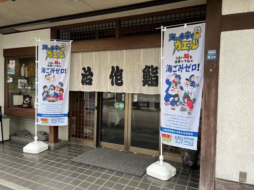 山梨県のすし店から海ごみゼロ!「ど根性ガエル」のオリジナルのぼり旗の掲出が始まりました。