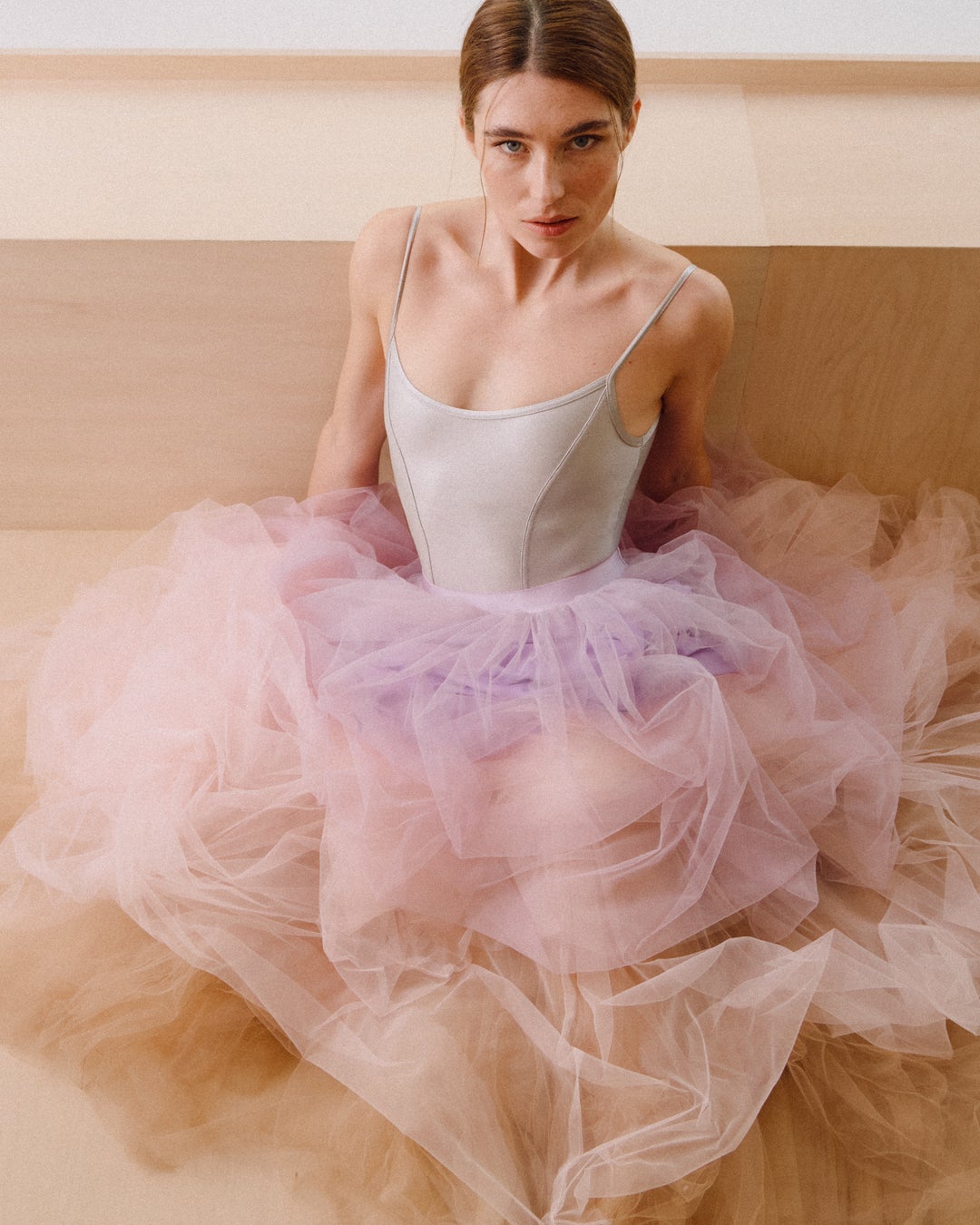 ラップオーバートップスとチュチュスカートという、バレエの世界を象徴するタイムレスな組み合わせに着想を得た本コレクション。やわらかなパープル、イエロー、ブルーの全3色のパステルカラーを展開し、軽やかで詩的なムードを描き出します。