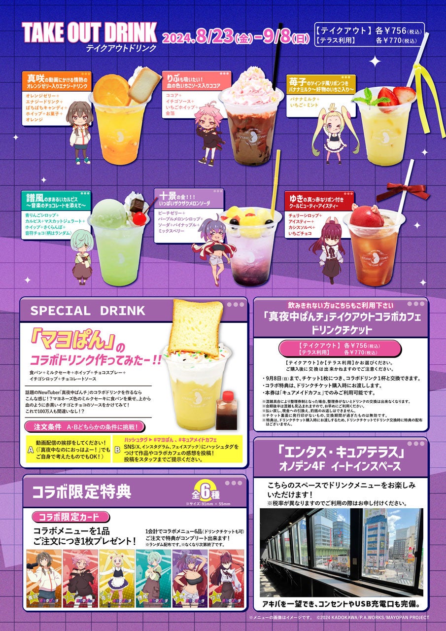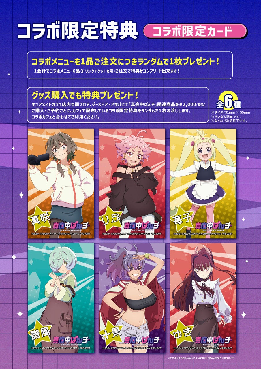 CURE MAID CAFÉ(キュアメイドカフェ)店内や同フロア、ジーストア・アキバにて「真夜中ぱんチ」関連商品を2,000円(税込)ご購入・ご予約ごとに、カフェで配布している<コラボ限定カード>をランダムで1枚お渡しします。コラボカフェと合わせてご利用ください。