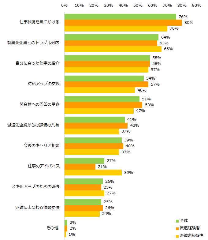 と伺うと、トップ3は「仕事状況を気にかける」(76%)、「就業先企業とのトラブル対応」(64%)、「自