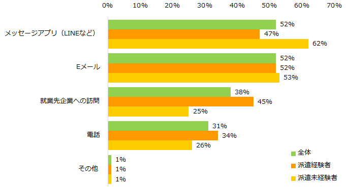 リ(LINEなど)」 、「Eメール」がいずれも52%で最多。経験別でみると、派遣経験者は派遣未経験者と比較