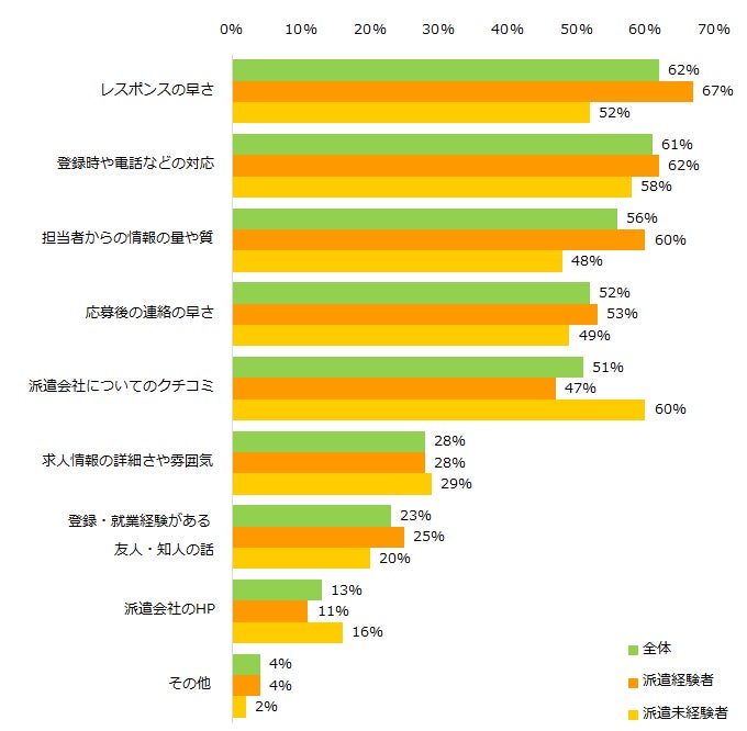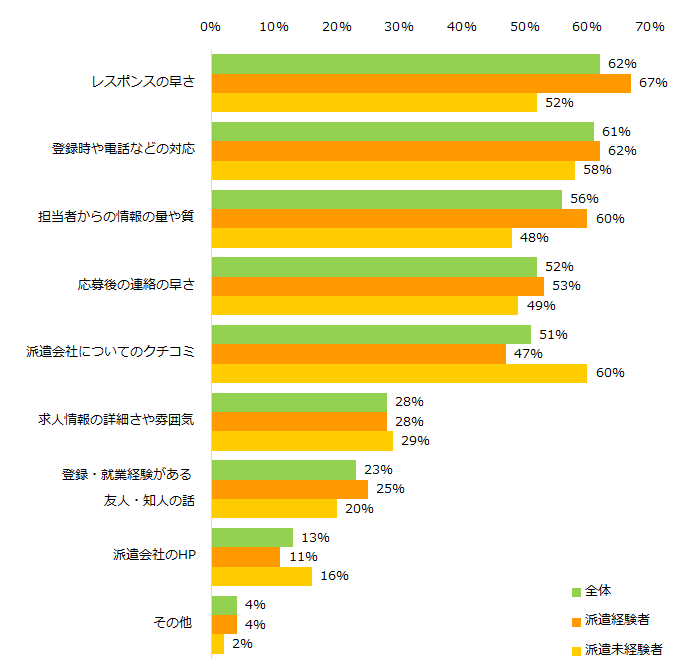(56%)でした。経験別では、派遣経験者の方が派遣未経験者と比較して「レスポンスの早さ」の回答が15ポ