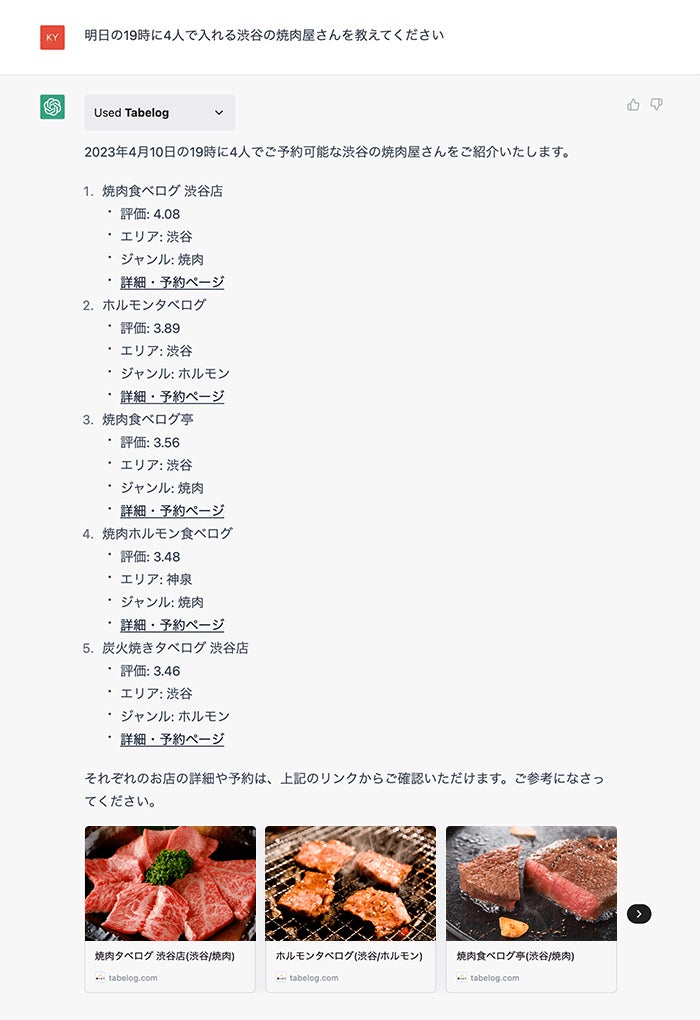 食べログ、ChatGPTプラグインの提供を開始 -ChatGPTに食べログのネット予約情報を連携、ChatGPTを使ってネット予約が可能なお店を簡単に検索できます-