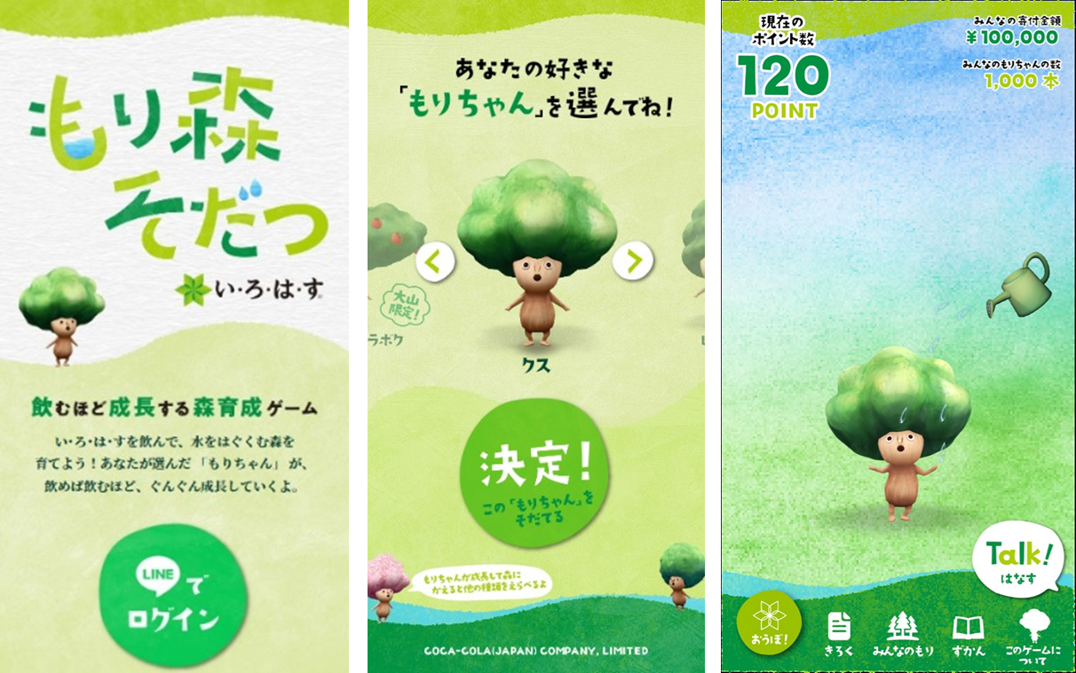 ・1日1回まで、「い・ろ・は・す」を購入しログインするごとに「もりちゃん」が成長し、1ポイントにつき1円が水系・森林を守る活動団体に寄付される。