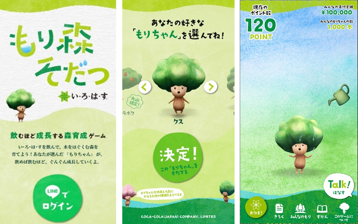「い・ろ・は・す」を飲み、“森”のキャラクターである「もりちゃん」をスマートフォンで楽しく育てることで、全国の水系・森林を守る活動へ寄付され、抽選で賞品がもらえる「もり森そだつ」キャンペーンが始まります。
