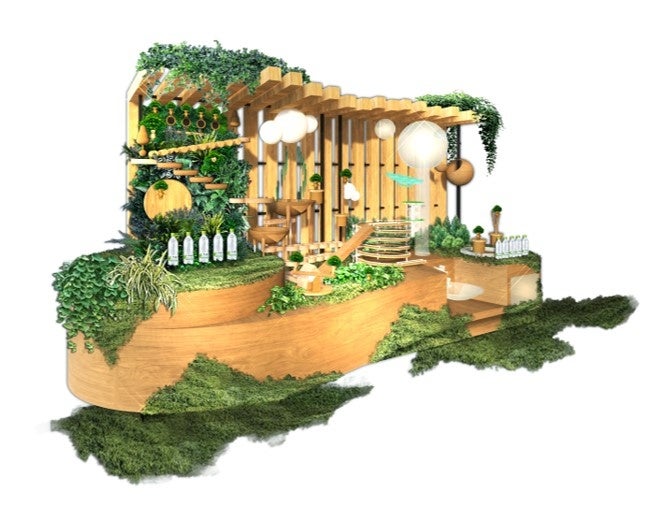 イベント会場に設置される特設の「未来の水を育てる い・ろ・は・すのか・ら・く・り」装置では、水を表現したボールが森や雨、地下水などを表現した各エリアを通過することによって森が育ち、水がめぐり、再びおいしい天然水として還ってくることを楽しく学ぶことができます。