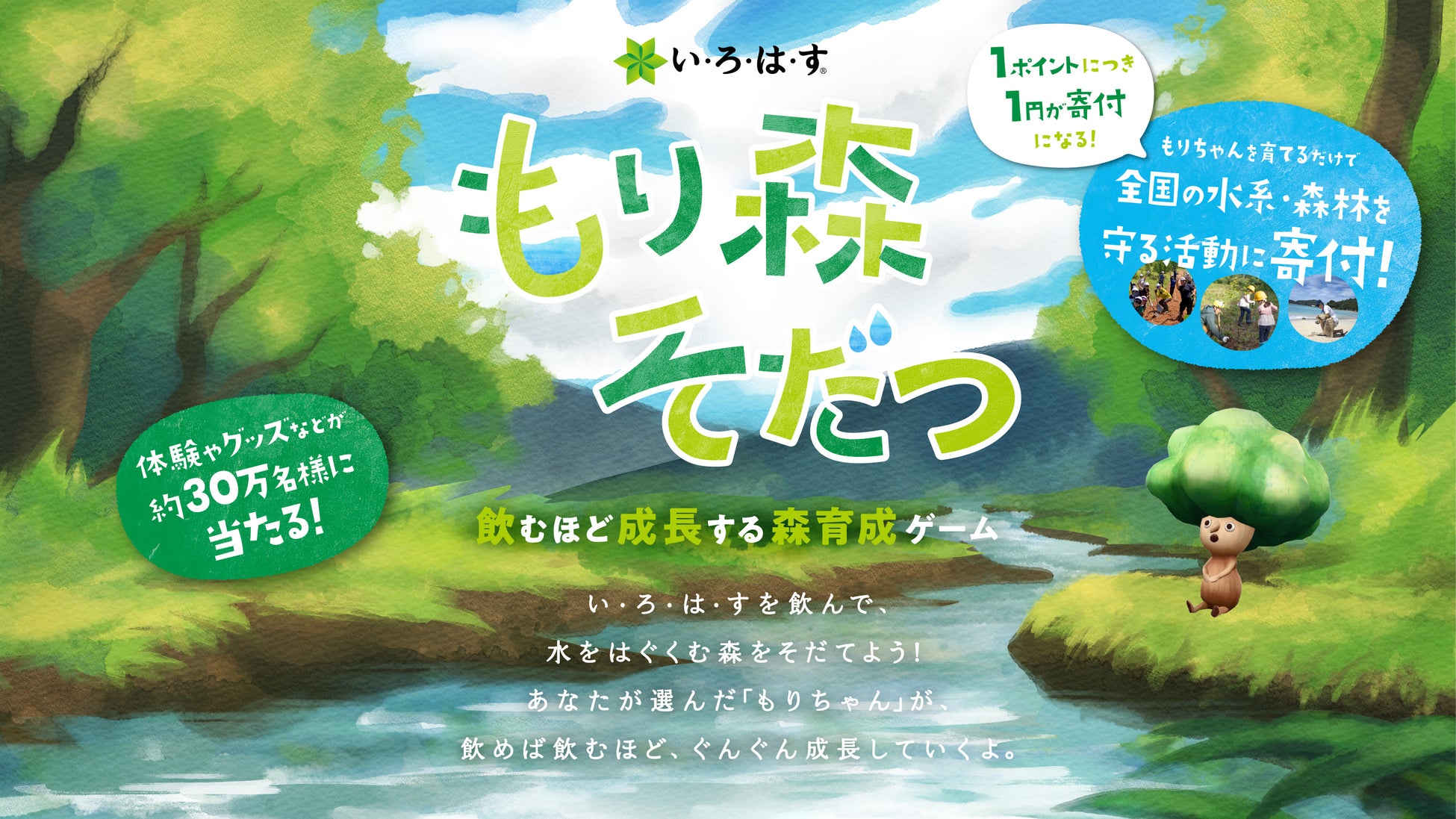 「い・ろ・は・す」を飲み、「もりちゃん」を楽しく育てることで、全国の水系・森林を守る15団体へ寄付が行われ、さらに抽選で賞品が当たる、森育成ゲーム「もり森そだつ」キャンペーンを4月1日(月)に開始します。